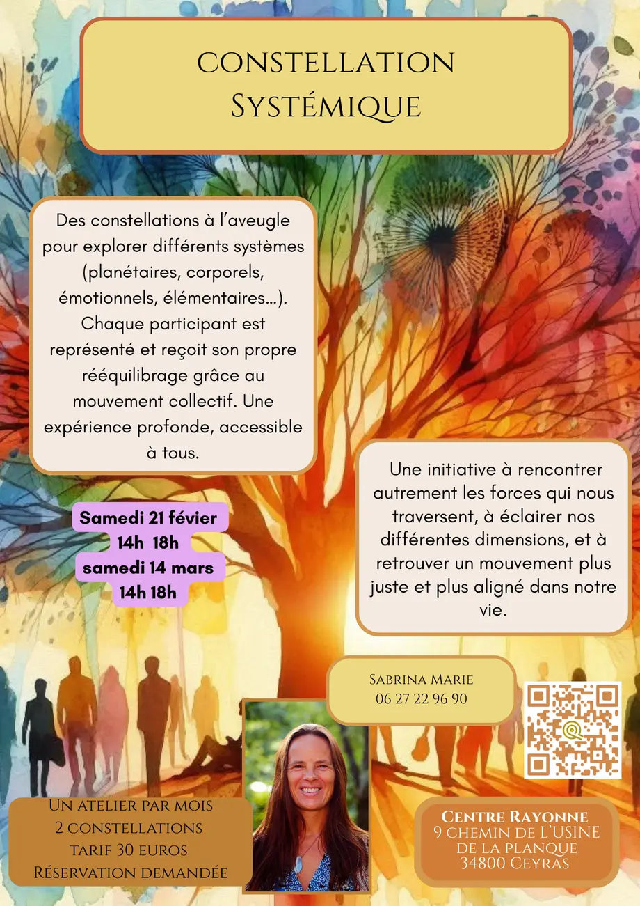 Constellation SystémiqueDu 13/02/2026 au 13/03/2026 CeyrasUne approche des constellations, inspirée des constellations systémiques, s’élargit bien au-delà du cadre familial.
