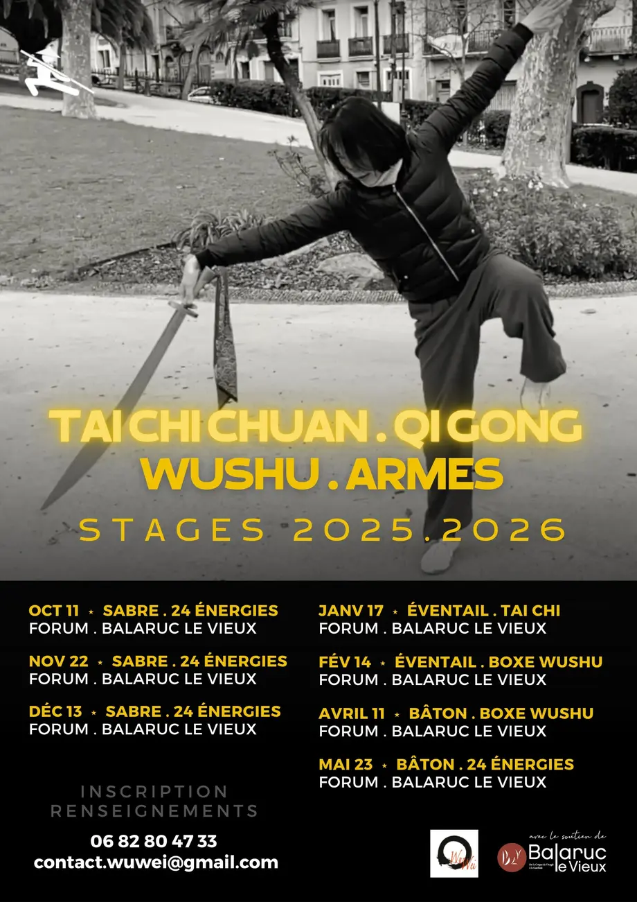De l’automne 2025 au printemps 2026, l’association Wuwei propose au Forum de Balaruc-le-Vieux une série de stages autour des armes traditionnelles (sabre, éventail, bâton) et des pratiques martiales chinoises.