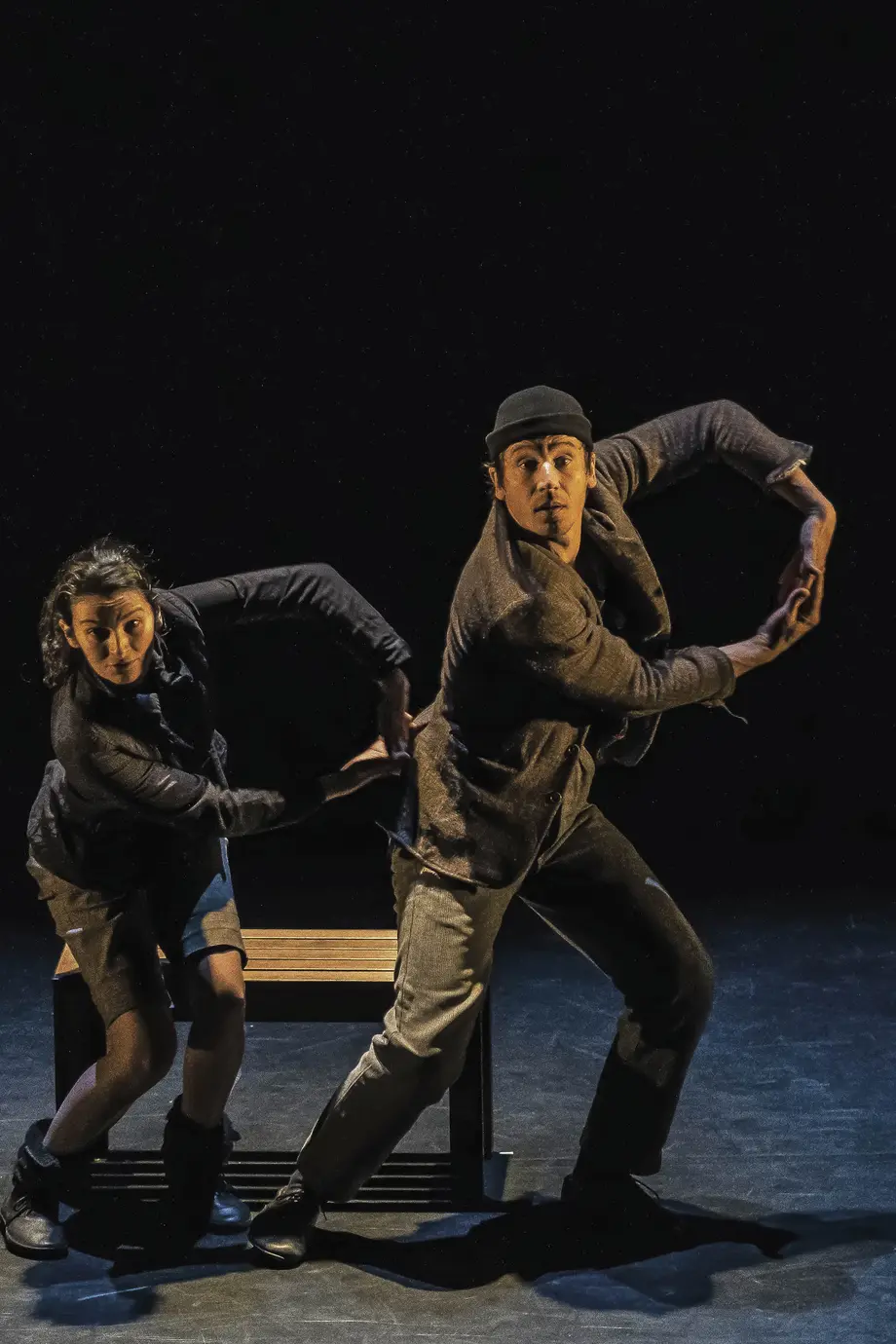Au moment où nous observons cet étrange binôme, rien ne nous indique son histoire. Accrochés l'un à l'autre, bouée ou boulet, ils se maintiennent au bord du gouffre, pour le meilleur et pour le pire. Ces deux riens, clandestins du réel, s'occupent, s'écrivent, s'inventent un ailleurs, un entre-deux, et choisissent de passer à l'abordage du monde réel par le biais du jeu. Entre danse et clowneries, le duo emporte les spectateurs du rire aux larmes sans prononcer le moindre son.