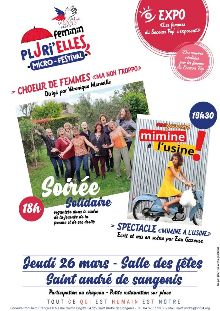 Le micro-festival Féminin Pluri'elles se tiendra le jeudi 26 mars 2026, à la salle des fêtes, à Saint-André-de-Sangonis, organisé par le Secours Populaire pour célébrer la solidarité envers les femmes. Cette journée mettra en avant les droits des femmes. Chansons et spectacles se succéderont au cours de la soirée. Entrée libre et gratuite. Venez nombreux pour une journée de culture et de solidarité ! Féminin Pluri'elles, c'est une invitation à la joie, la réflexion et l'humour avec une programmation riche et variée.