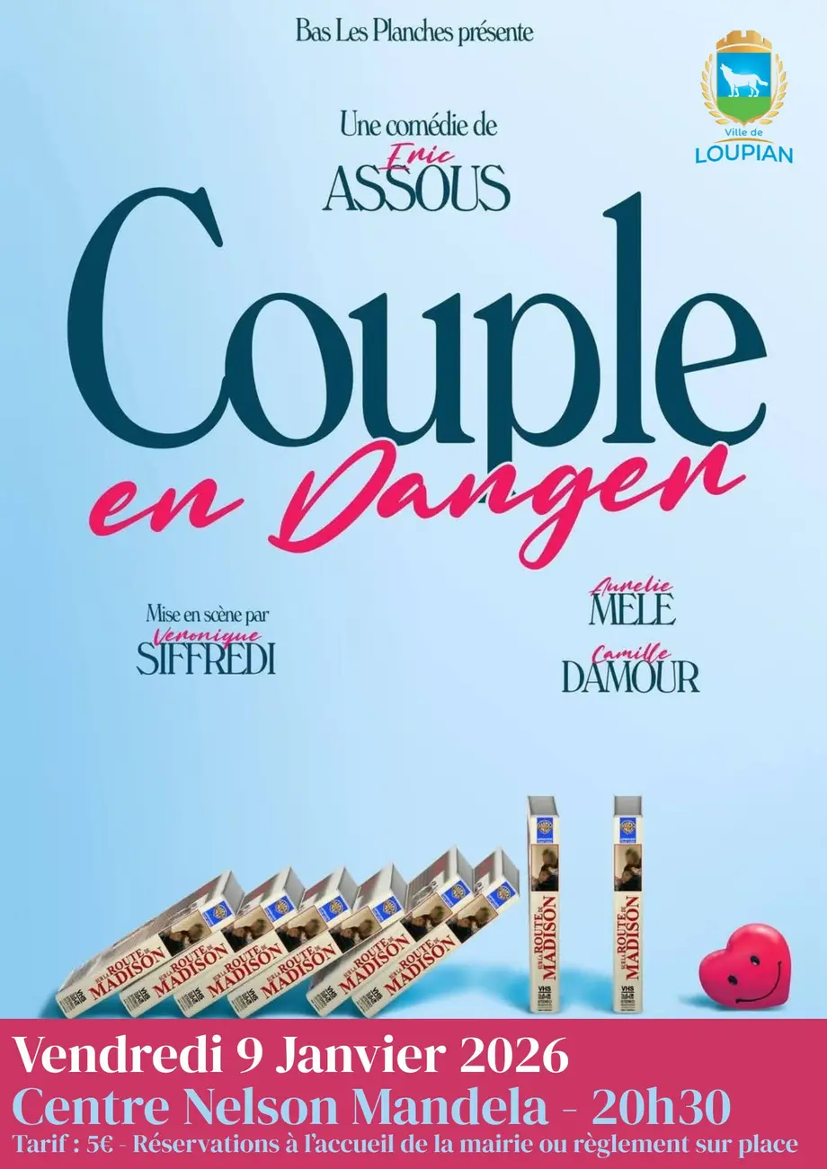 La compagnie Bas les Planches sera présente le vendredi 9 janvier, à 20 h 30, au Centre Nelson Mandela, à Loupian, pour présenter la pièce de théâtre « Couple en danger », une comédie romantique drôle et attendrissante d’Éric Assous.