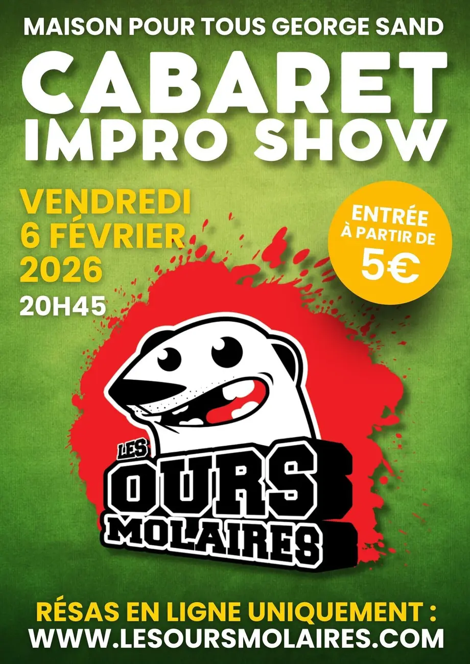 Les Ours Molaires vous donnent rendez-vous le vendredi 6 février pour une soirée d’impro totalement imprévisible, basée sur vos thèmes. Pas de texte, pas de plan : vos idées seront le point de départ de chaque impro. Rires, surprises, plantages glorieux et moments magiques garantis. Spectacle familial pour toute la famille dans un cercle familial relatif à la famille.