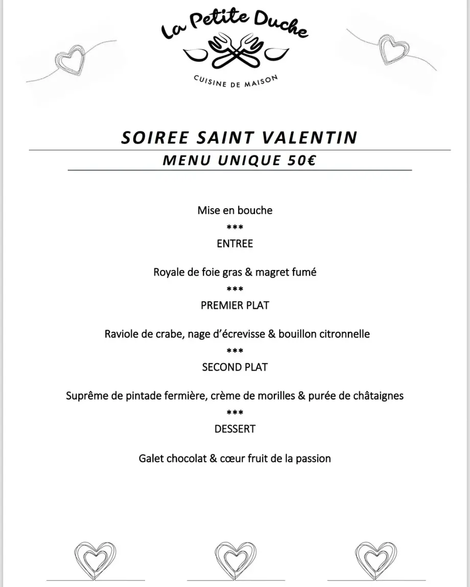 Menu de la Saint-Valentin : samedi 14 février, le soir : 50 € par personne, sur réservation.