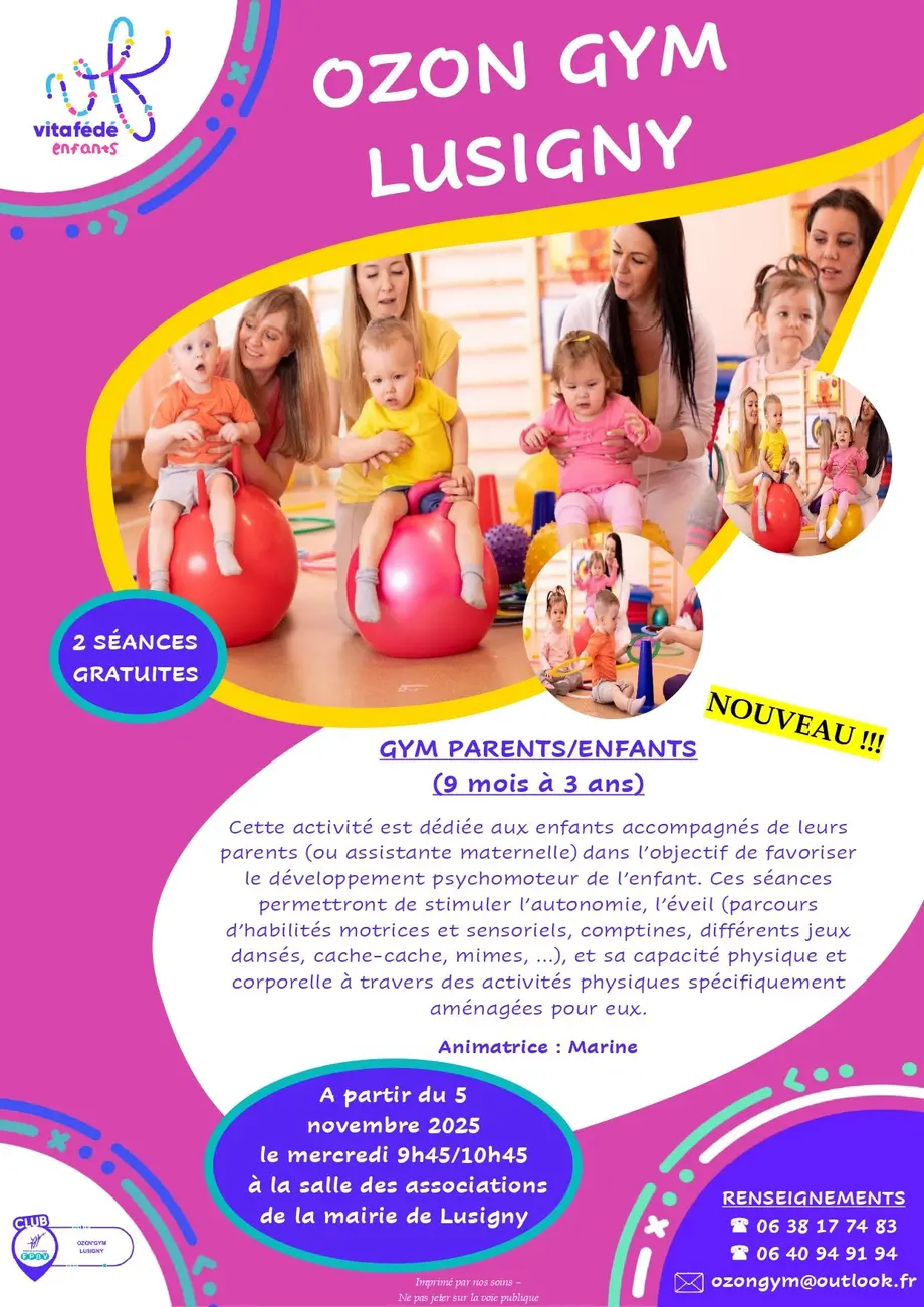 Venez essayer une heure de séance de gym parents et enfants de 9 mois à 3 ans, à partir du mercredi 5 novembre 2025, de 9h45 à 10h45, à la salle des associations de la mairie de Lusigny.