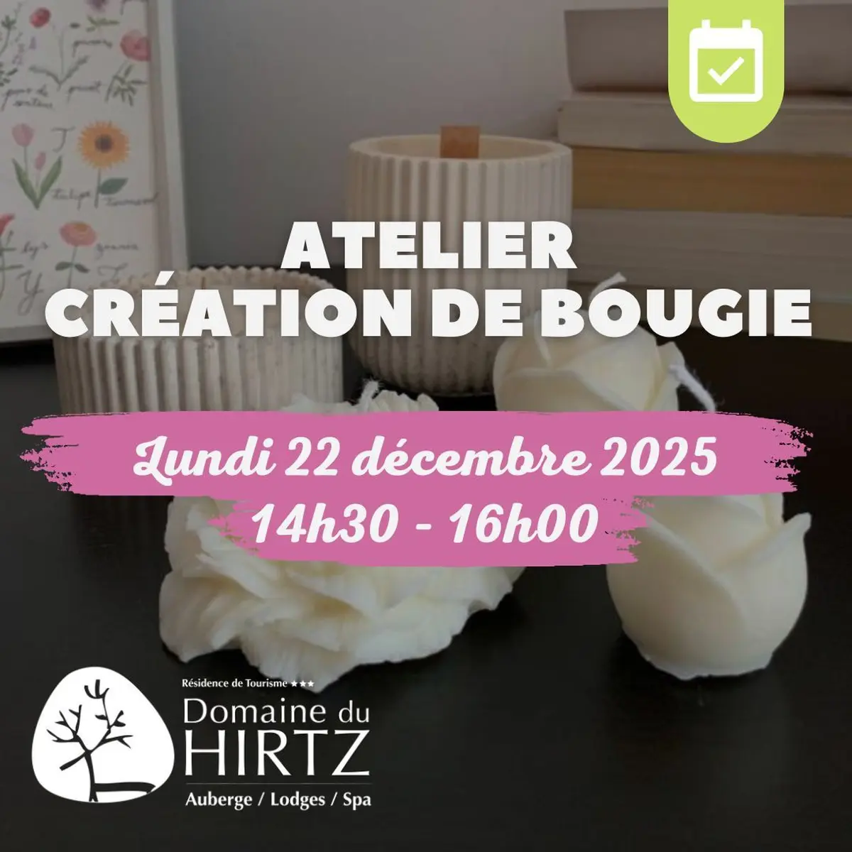 Le lundi 22 décembre 2025, de 14h30 à 16h, le Domaine du Hirtz accueille CaméliArt pour un atelier unique : la création de votre propre bougie artisanale.