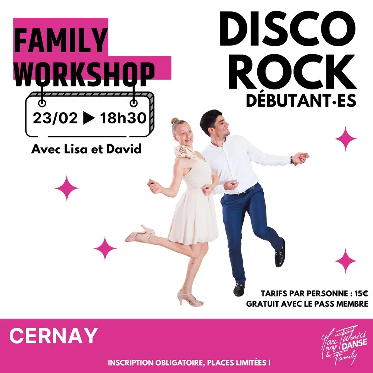 L’École de Danse Marc Fabrici & Family propose un Family Workshop Disco Rock ouvert à tous les niveaux, pour vivre un moment festif, dynamique et convivial autour de la danse à deux.