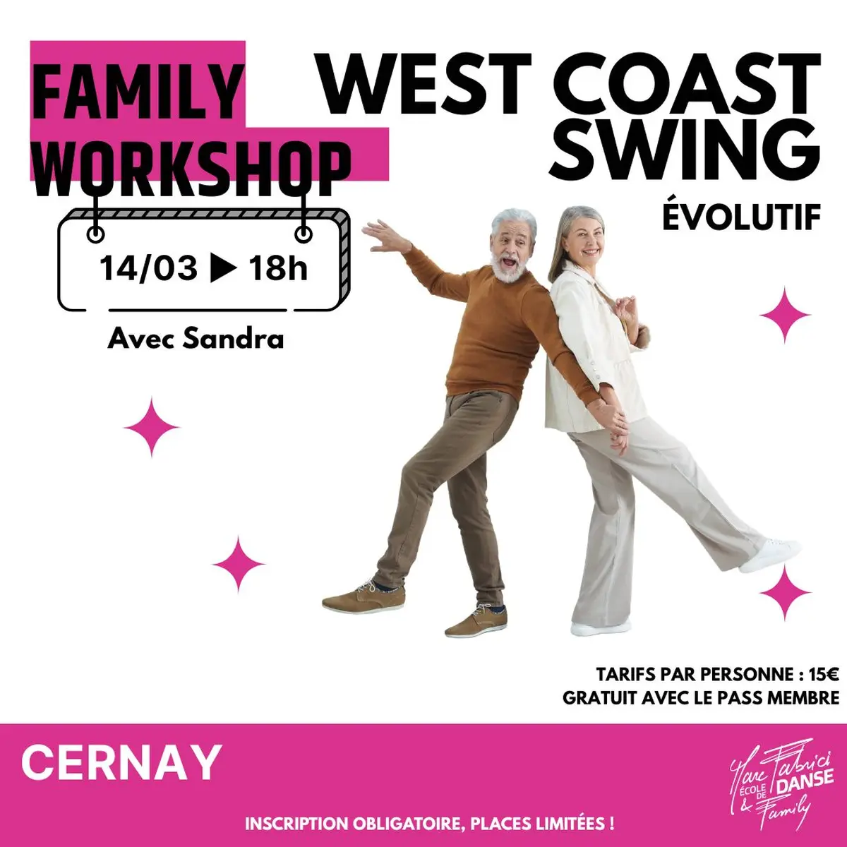 L’École de Danse Marc Fabrici & Family propose un Family Workshop West Coast Swing niveau évolutif, destiné aux danseur·ses ayant déjà acquis les bases et souhaitant approfondir leur pratique.