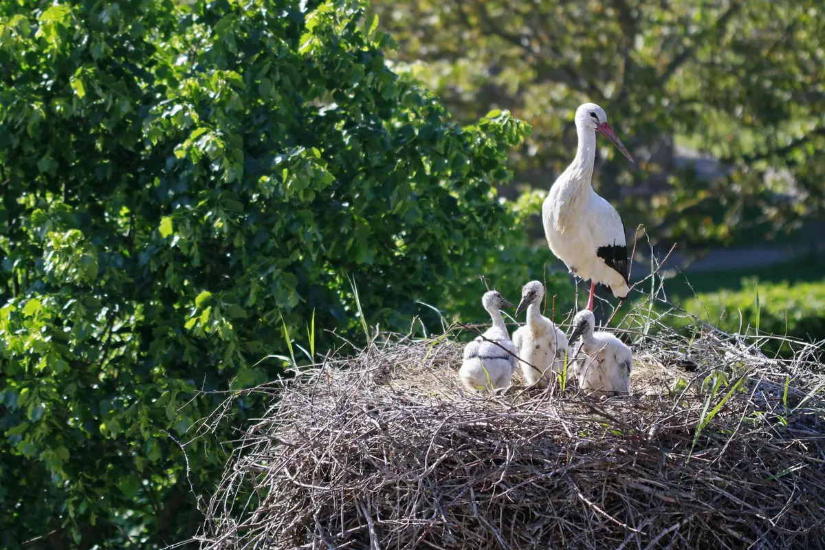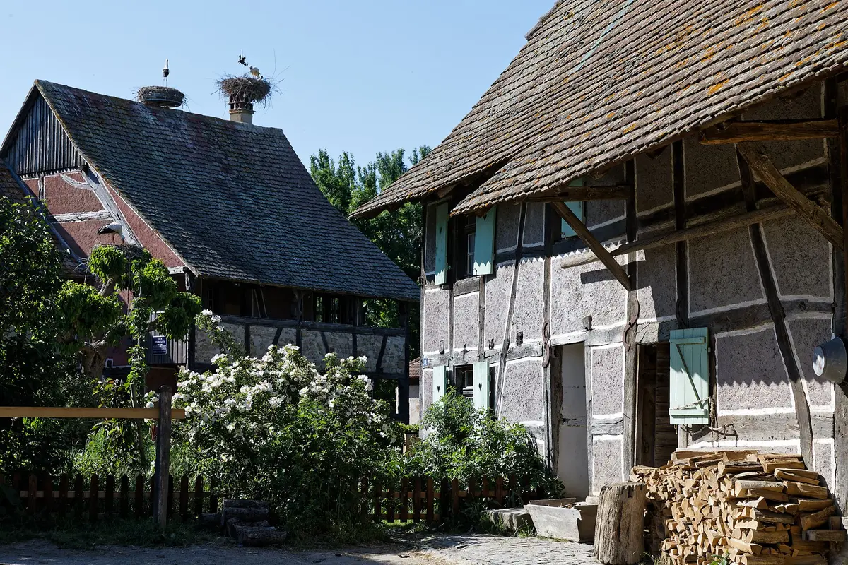 Les cigognes s'installent sur les maisons de l'Écomusée