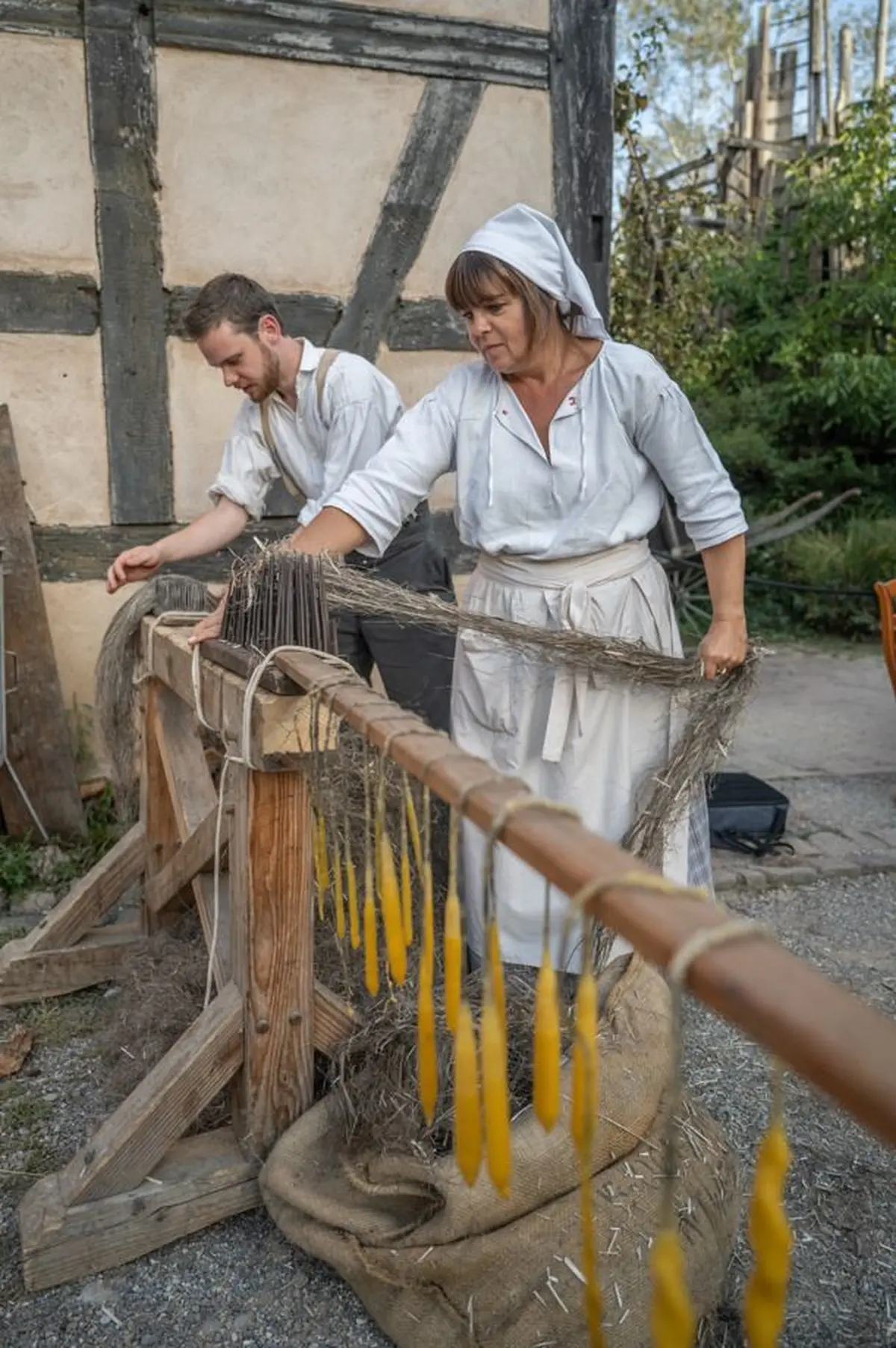 Dès le franchissement du portail, le temps semble ralentir : maisons à colombages colorées, jardins potagers soignés, place de village animée… Les enfants et leurs parents découvrent l'histoire à travers des rencontres avec les artisans : forgeron, menuisier, cuisinier ou encore vigneron transmettent leur savoir-faire dans une ambiance conviviale et interactive.