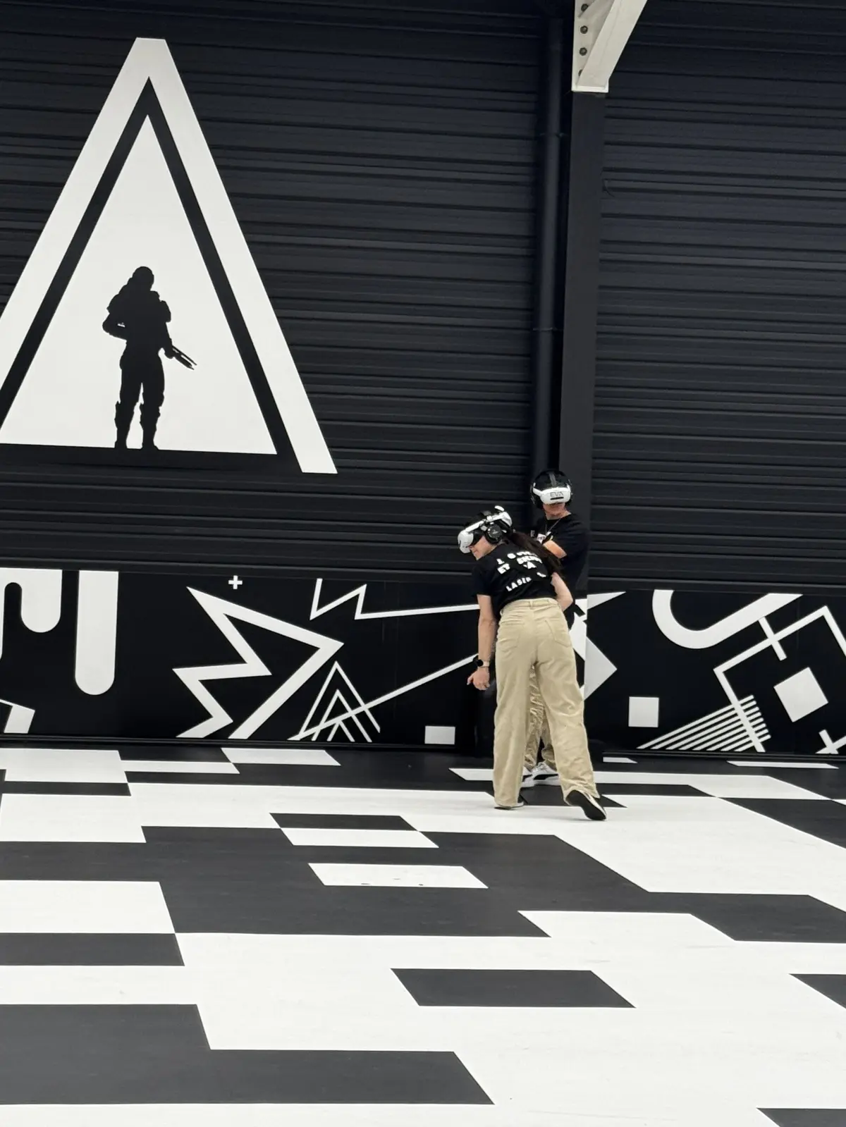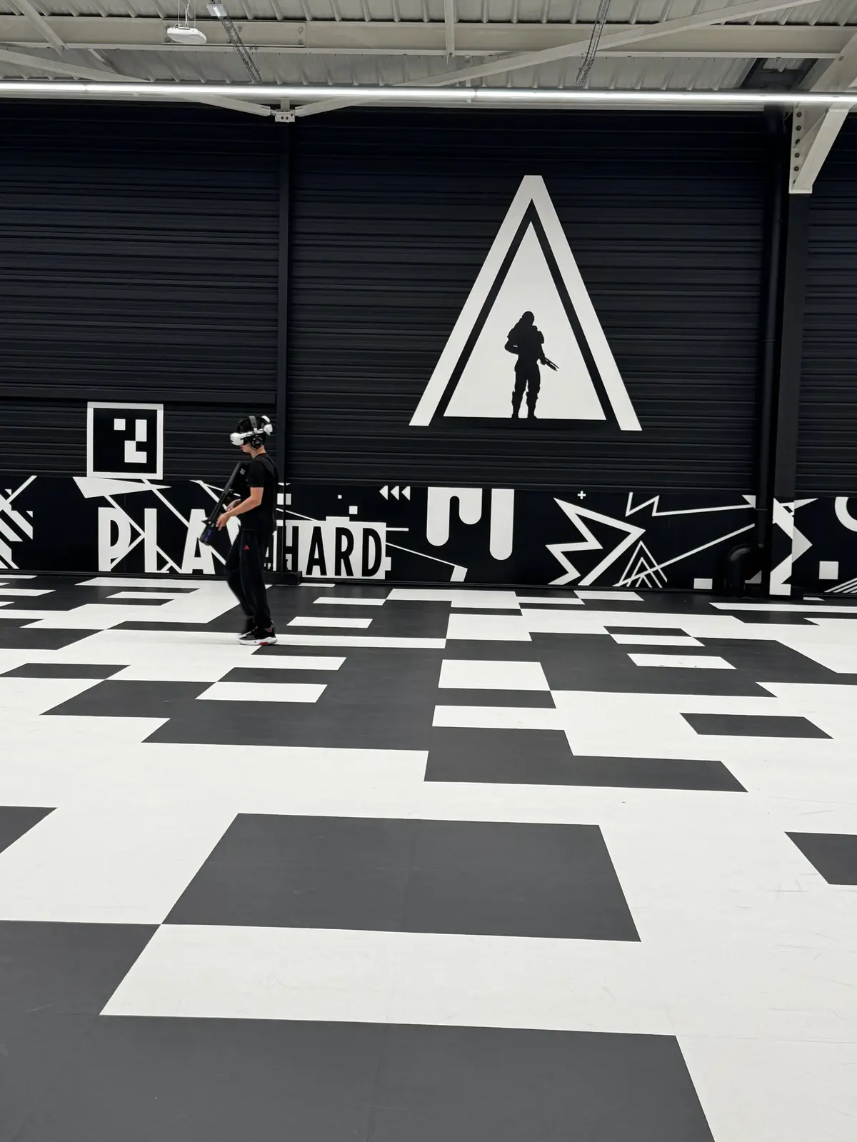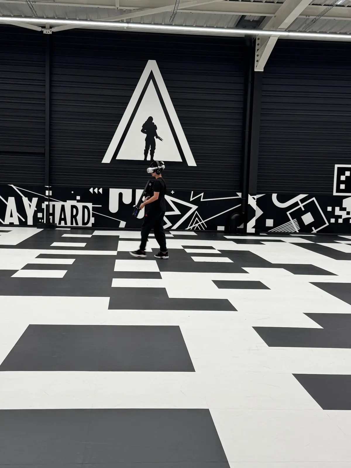 Une fois connecté à votre compte, vous passez de l'autre côté et arrivez dans la zone de jeu - la fameuse arène. Ici, le game master vous équipe : charlotte pour l'hygiène, casque de VR et casque audio, arme avec ses boutons et joysticks. Ensuite, la magie opère : une ligne vous guide jusqu'à votre point de départ. C'est le moment de choisir votre skin (l'apparence de votre personnage virtuel) et vos armes. Une fois tout le monde en place, le jeu peut commencer !