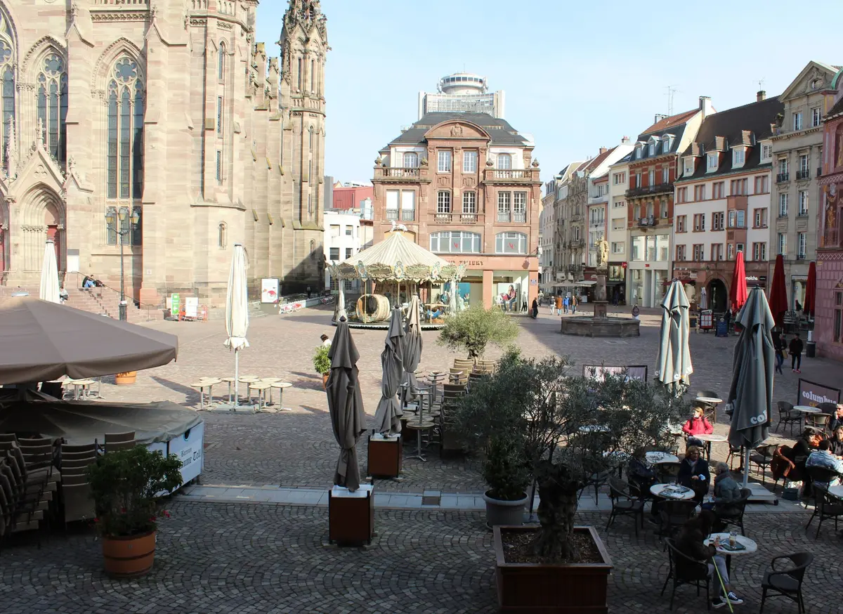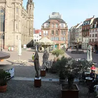 L'établissement dispose d'une belle salle à l'étage, dominant la Place de la Réunion avec une vue dégagée sur le Temple Saint-Etienne. La terrasse, installée justement sur la place vous permet de profiter des belles journées. C'est l'endroit idéal pour votre pause entre deux rendez-vous ou lors d'une virée shopping au centre-ville de Mulhouse - seul, entre amis ou en famille.