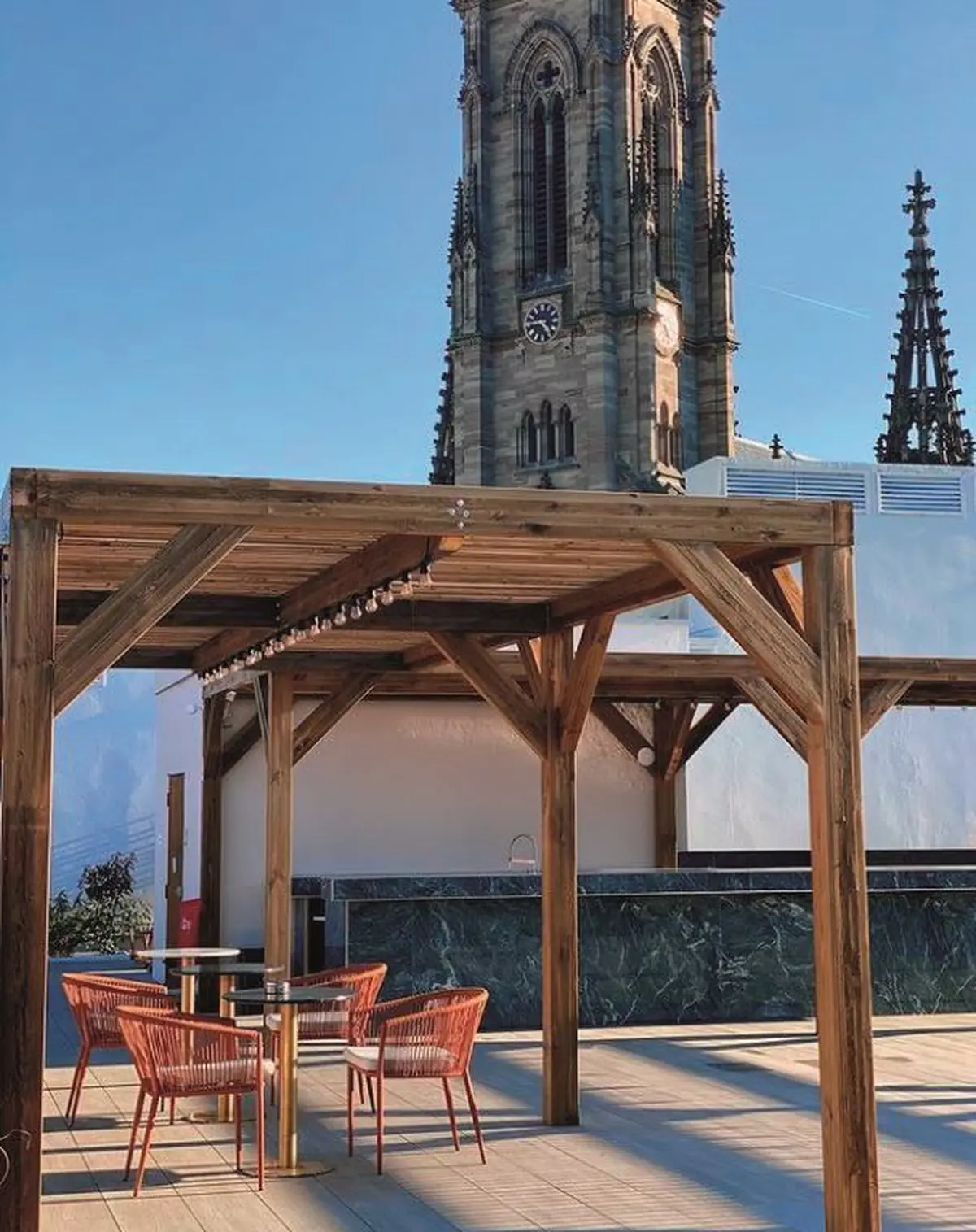 Allez faire un tour sur la grande terrasse pour admirer le clocher du Temple de nuit : ça n'a pas de prix !