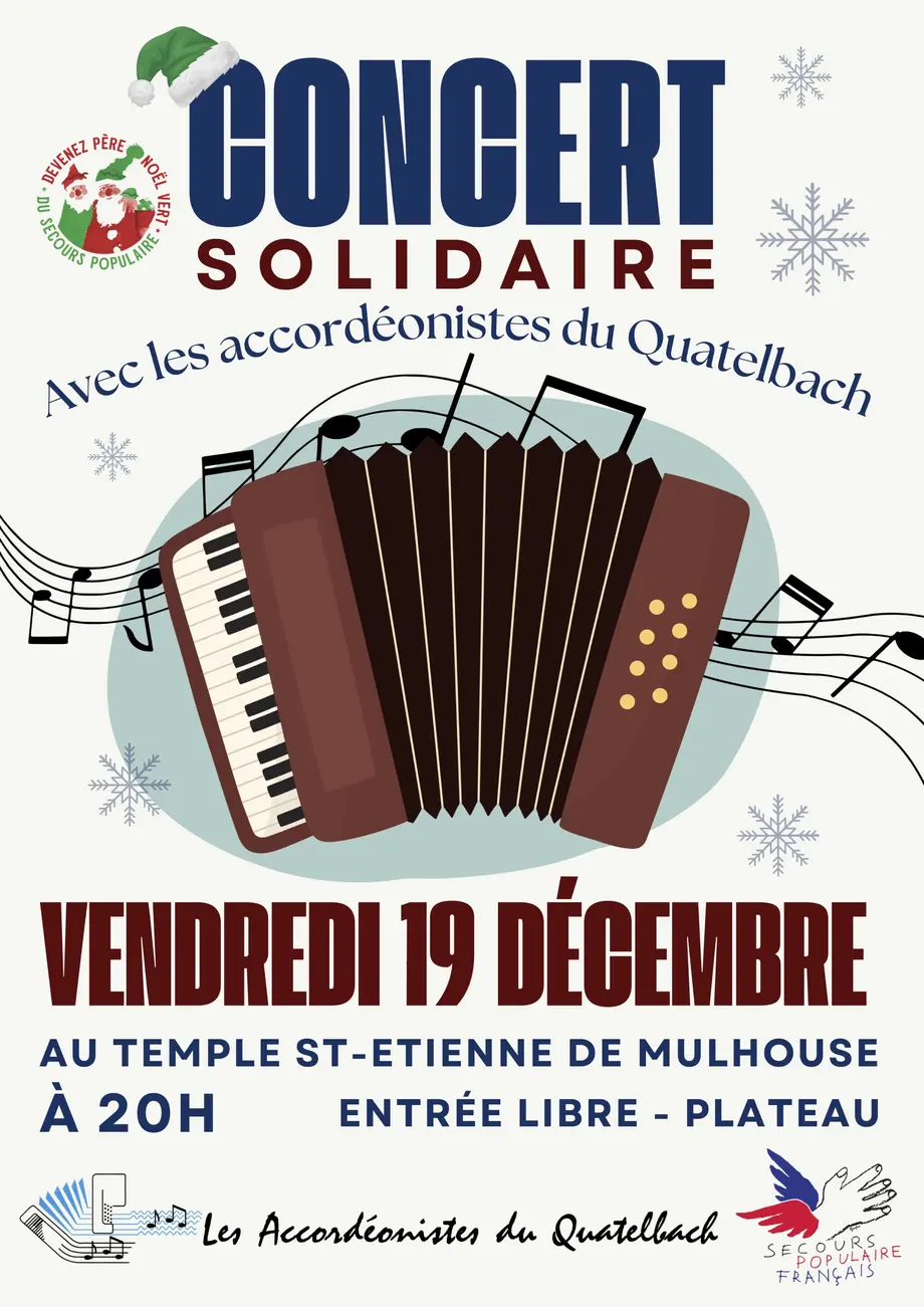 En partenariat avec le Temple Saint-Étienne de Mulhouse, le Secours populaire du Haut-Rhin organise un concert solidaire, qui se tiendra le vendredi 19 décembre à 20h. Inscrit dans la programmation de l’Avent du Temple, cet évènement mettra à l’honneur les accordéonistes du Quatelbach, basés à Sausheim.