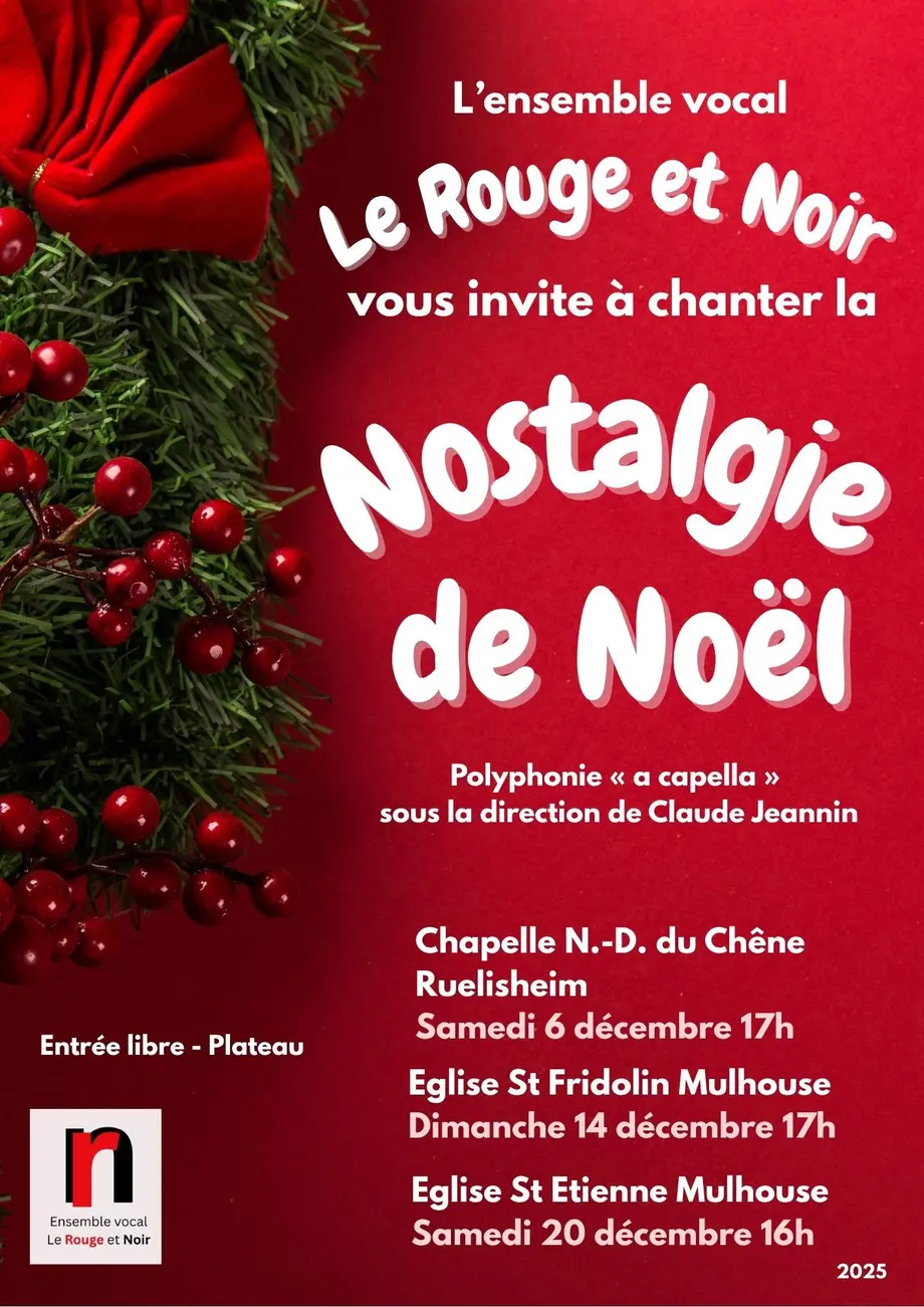 L'ensemble vocal Le Rouge et Noir se réjouit de vous présenter un concert de Noël de qualité et tout en NOSTALGIE, sous la direction de Claude Jeannin, chef de chœur, dans la belle et grande église catholique St Etienne, située place de la Paix à Mulhouse.