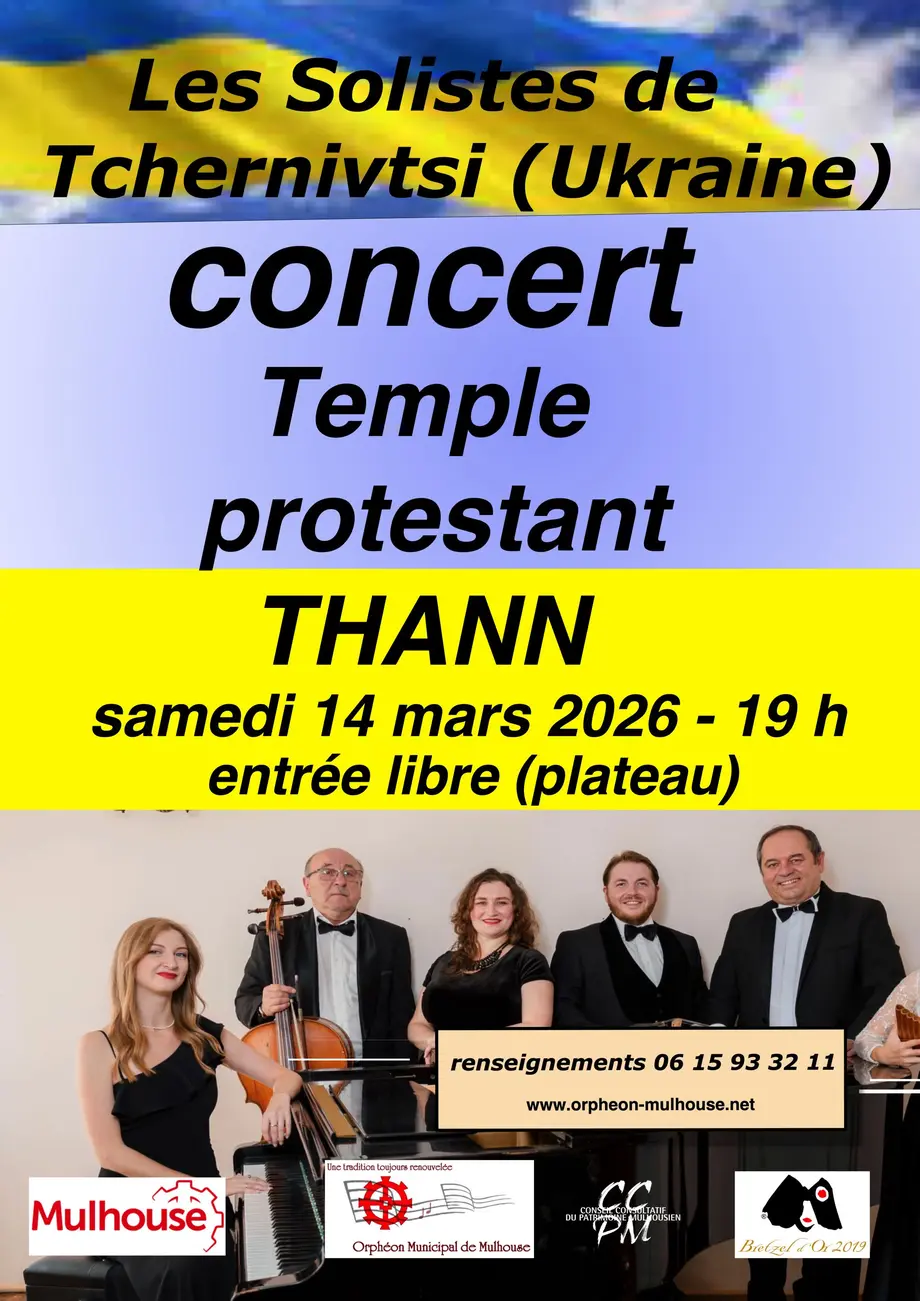 Les Solistes de Tchernivtsi bien connus en tant que partenaires de l’Orphéon Municipal de Mulhouse, se produisent dans des lieux différents du 14 mars au 22 mars 2026 dans le cadre d'un festival sur le thème des "Plus belles musiques du monde".