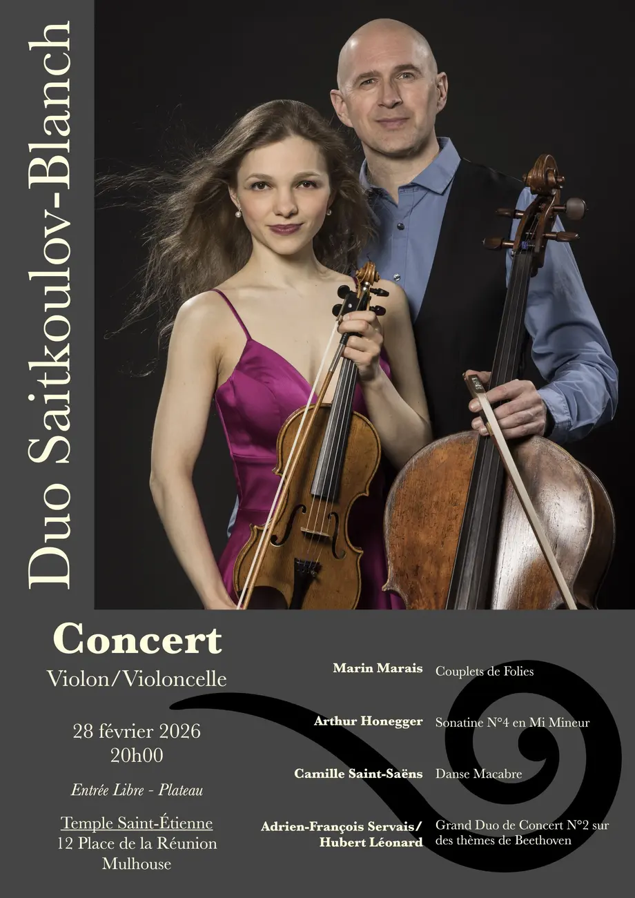 Le duo formé par la violoniste Clara Saitkoulov et le violoncelliste Tomas Blanch propose un programme vibrant aux couleurs françaises le 28 février 2026 à 20h au Temple Saint-Étienne de Mulhouse. Intitulé Échos français, ce concert traverse les siècles, de la Renaissance au XXᵉ siècle, mêlant fougue, élégance et virtuosité.