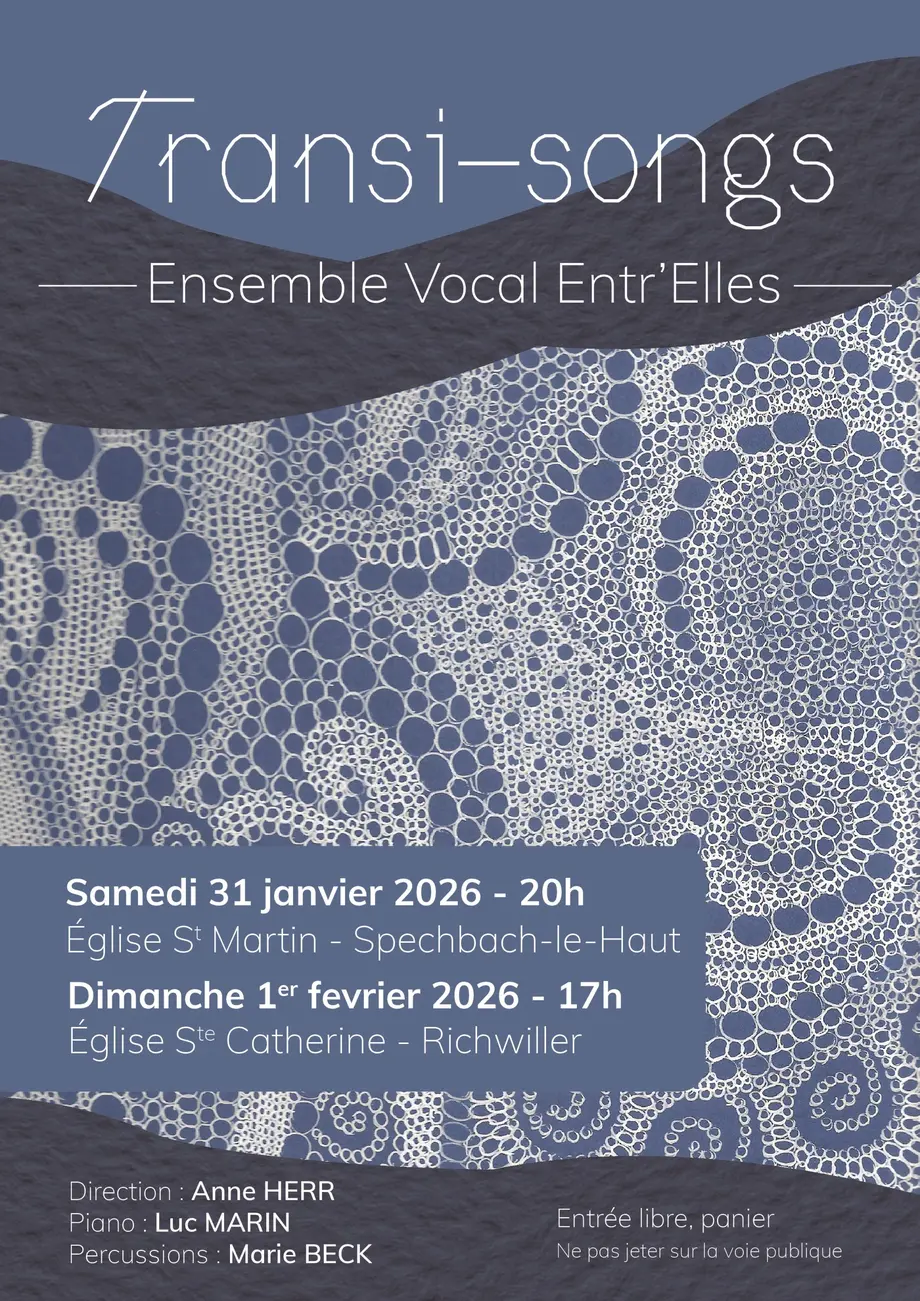 Entr'Elles vous propose, par ces grands froids, un concert en deux temps : l'un tourné vers le besoin de se réchauffer le coeur par les bons souvenirs des fêtes de fin d'année encore toutes proches, ou des contemplations, des pensées vagabondes. Et le second, plus dynamique, pour poursuivre cette rêverie intime vers de nouveaux horizons, plus lointains, comme un petit vent de fraîcheur. Une vraie transition, portée par les voix, sous la direction d'Anne HERR : "Transi - songs" !
