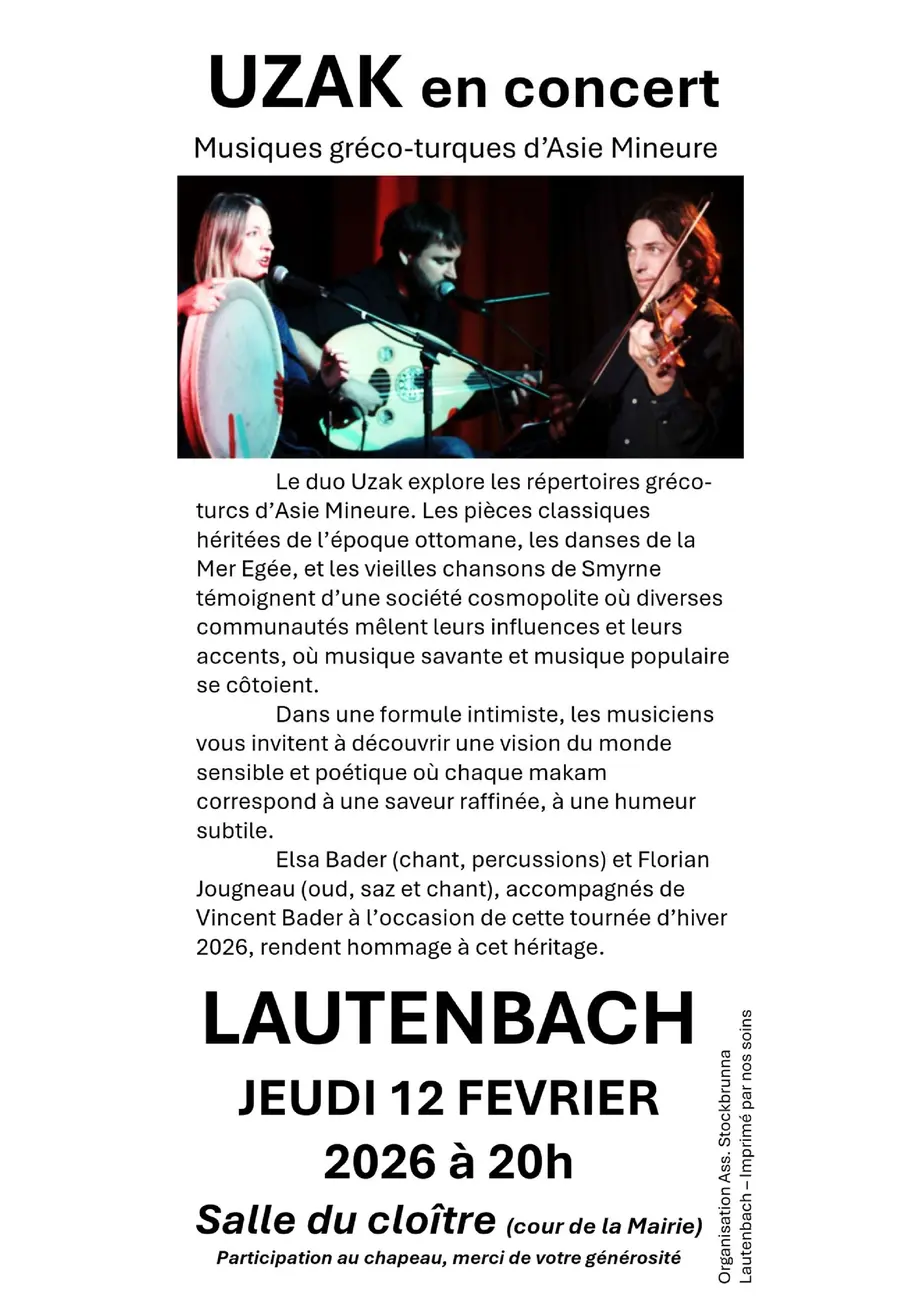 Elsa Bader (chant, percussions) et Florian Jougneau (oud, saz et chant), accompagnés de Vincent Bader à l’occasion de cette tournée d’hiver 2026, rendent hommage à cet héritage.