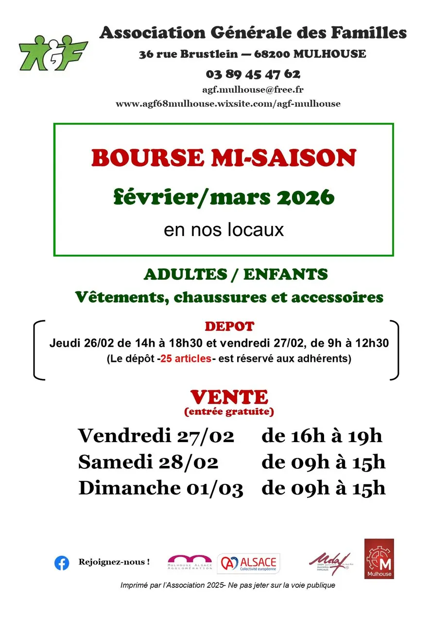 L'Association Générale des Familles organise une bourse mi-saison adultes / enfants (vêtements, chaussures, accessoires (sacs à main, ceintures, bijoux...)