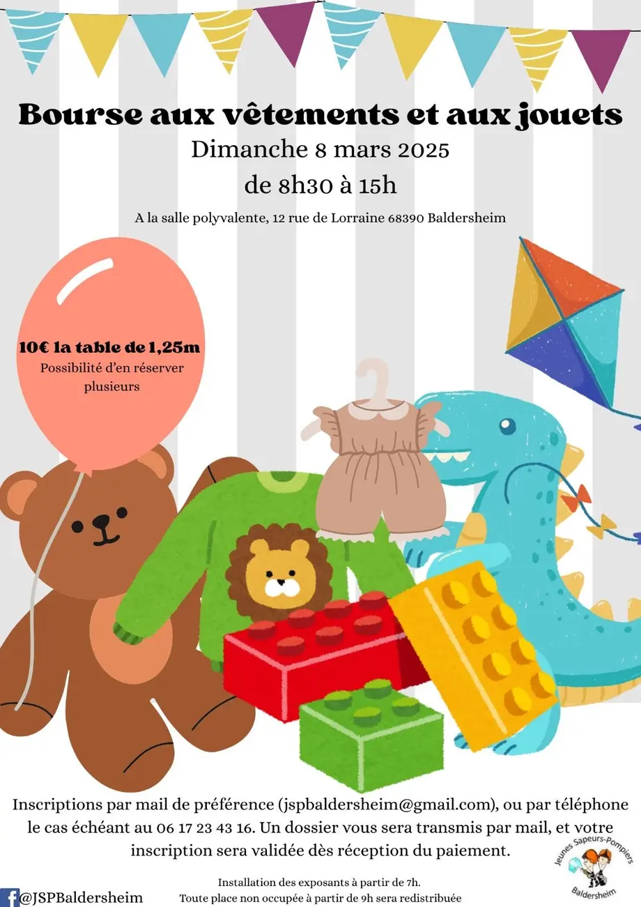 L’association des jeunes sapeurs-pompiers de Baldersheim organise sa 3ème bourse aux vêtements et aux jouets, le dimanche 8 mars 2026 de 8h30 à 15h.