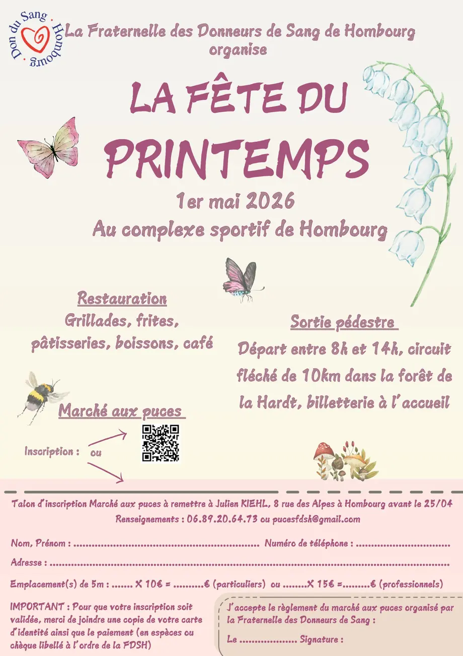 Nous vous attendons pour la traditionnelle fête du Printemps le 1er mai 2026 (marché aux puces, sortie pédestre et restauration). Comme chaque année, elle sera organisée par la Fraternelle des donneurs de sang de Hombourg. Trouvez l'ensemble des informations utiles dans le flyer ci-joint.