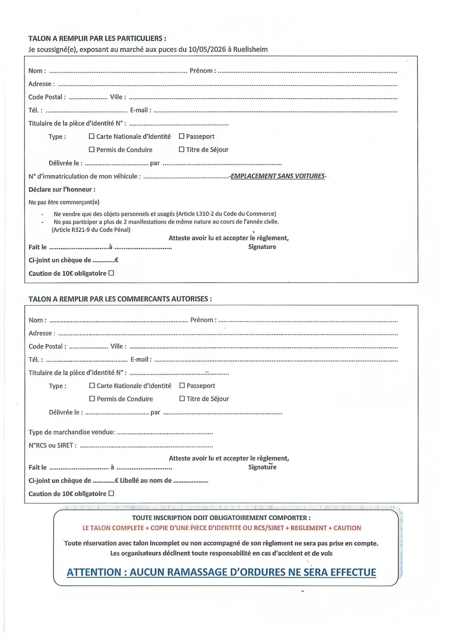 Particuliers - 5 mètres - 15€ | Commerçants - 5 mètres - 30€ | Caution 10€ par stand