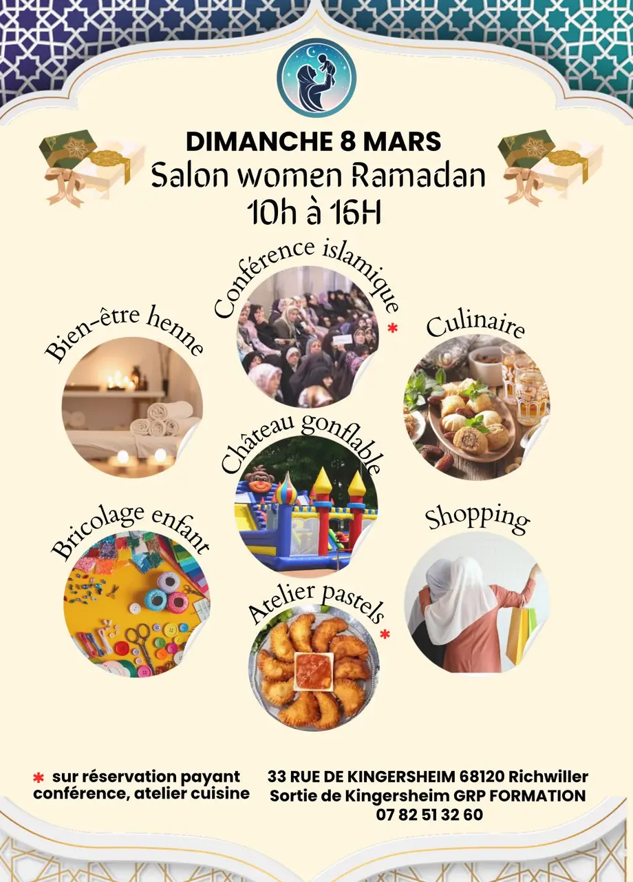 Bonjour nous organisons un salon dédié aux femmes pour prendre soin d’elle sur place coiffure, produits de beauté, maquillage tenue, vestimentaire, culinaire, bien-être également. Activité petit bricolage pour les enfants pour les occuper Conférence Conférence spirituelle, dédiée également aux femmes, il y aura également un atelier culinaire, je vous laisse venir découvrir par vous-même Mesdames. Prenez soin de vous et pense un petit peu à vous et venez faire de très belles rencontres entre femmes vous ne serez pas déçu car nous en avons besoin pour notre santé