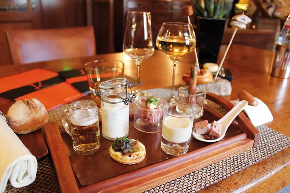 Le service démarre, pourtant, Jean-Marc Kieny, espiègle, se plaît à lancer quelques plaisanteries à sa brigade. « Tenez-vous bien encore cinq minutes ! Quand le journaliste sera parti, vous pourrez recommencer les bêtises ! » Là où il n'y pas d'humour, il n'y a pas d'humanité - la phrase de Ionesco sied bien à notre chef. Et dans l'assiette, cette même humanité prend vie. Son plat-signature, les tapas alsaciens (en photo), en sont peut-être l'exemple le plus parlant. Petit bretzel, hareng et pomme verte, museau, bibeless' ou encore foie gras sur confit de berawecka... Voilà un clin d'oeil à la région, mais aussi aux plats typiques que les générations précédentes de Kieny préparaient. Quand on vous disait que ce cuisinier avait la famille dans le sang.