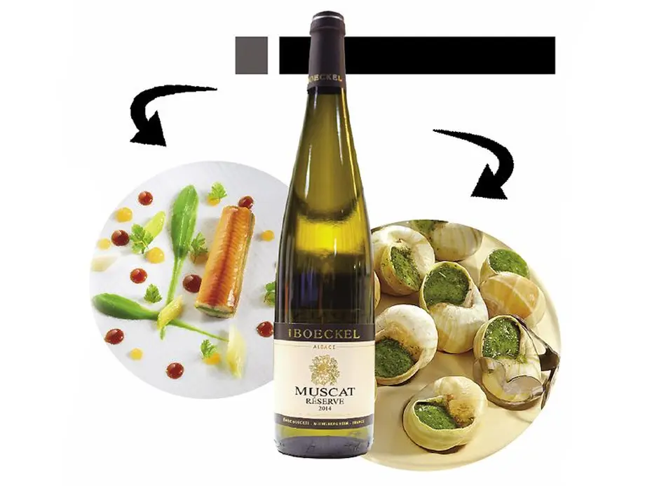 « Je ne choisis pas n'importe quel Muscat, car c'est sans doute le cépage le plus difficile à réussir en Alsace. Il se doit d'être frais, croquant, avec des arômes de fleur blanche et un nez exubérant, mais doit rester sec. Mon coup de coeur, c'est le Muscat Réserve 2014 de la maison Boeckel à Mittelbergheim près d'Andlau », explique notre sommelier et caviste. Il poursuit : « Thomas Boeckel est un vigneron sans concession, un vrai paysan au sens noble du terme, proche de ses vignes, je crois même qu'il leur parle un peu. Surtout, il intervient le moins possible en cave. Ainsi, le cépage n'est pas malmené, il y a une retranscription directe, du raisin à la bouteille. Son Muscat est gourmand et aromatique, mais sans être trop rond, c'est tout ce qu'on a envie d'avoir dans un bon Muscat d'Alsace. »