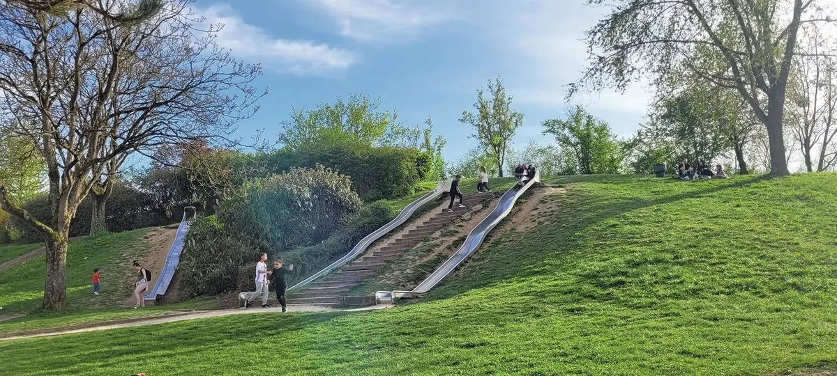 Le Parc Wallach de Riedisheim séduit davantage par son cadre naturel que par la modernité de ses installations. Son aire de jeux, nichée à l’ombre des arbres, reste un lieu très apprécié des familles. On y trouve de larges pelouses, un parcours pour apprendre à faire du vélo ou du roller, et surtout... un toboggan culte des années 80 qui ravive bien des souvenirs !