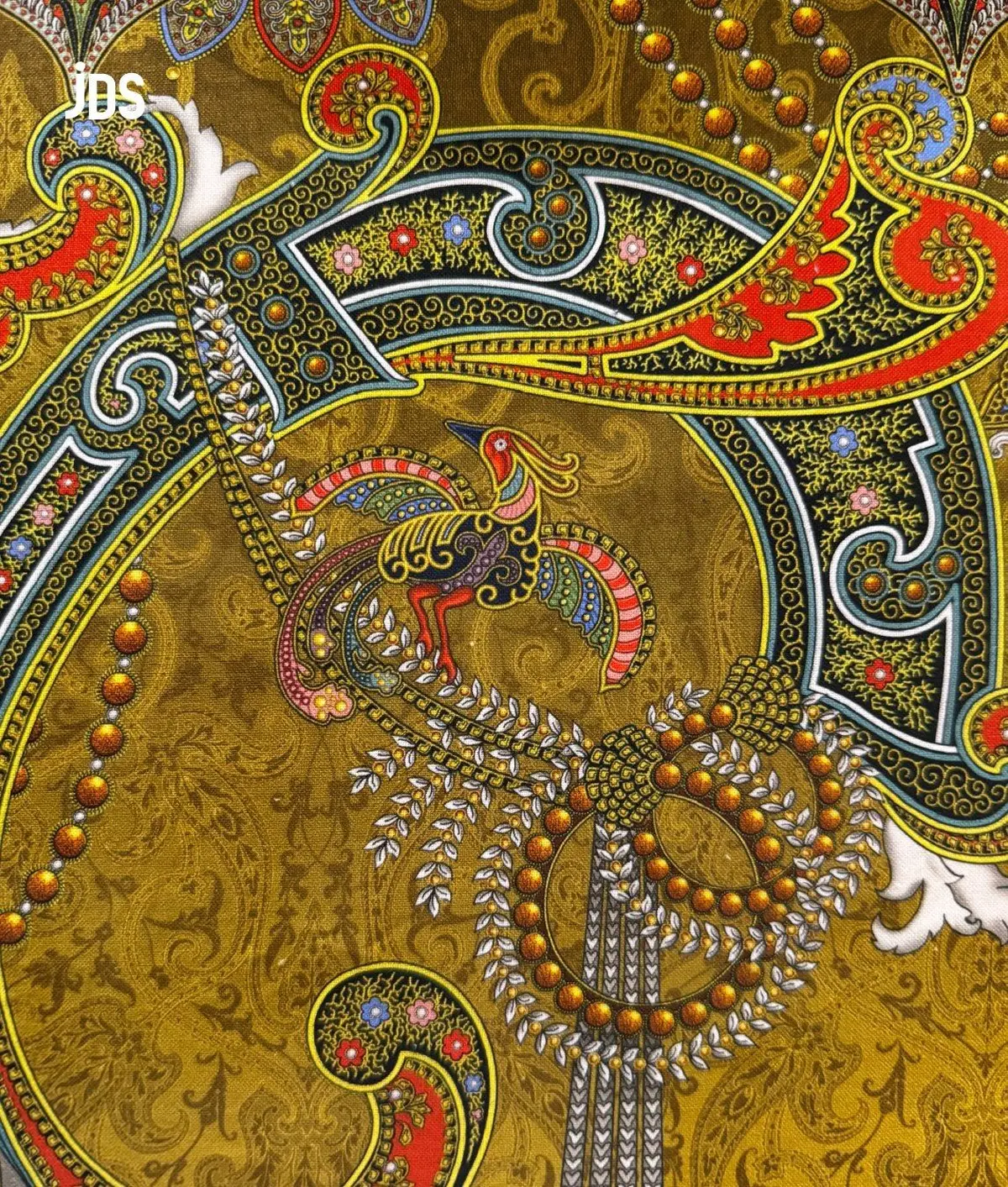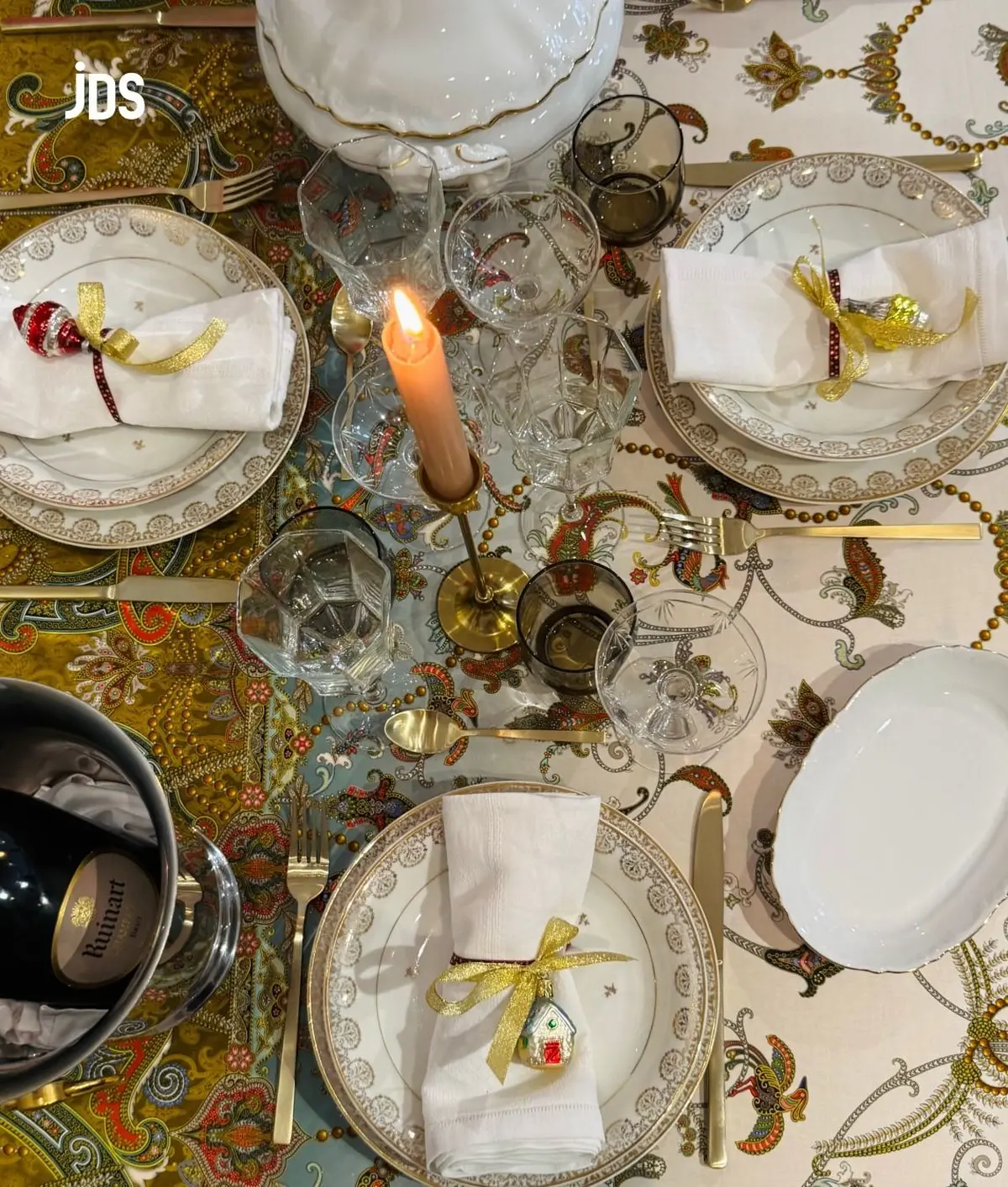 On y retrouve des motifs d’oiseaux de paradis et d’entrelacs cachemire, relevés par des touches de doré, sur des fonds ivoire et bleu glacé/céladon. Une composition raffinée qui évoque à la fois les brumes du Rhin et l’éclat des lumières de fêtes.
