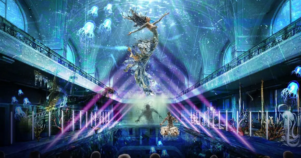 Imaginez un spectacle son et lumière dans une piscine vide, sublimée par des hologrammes, des projections géantes et de la danse aérienne.