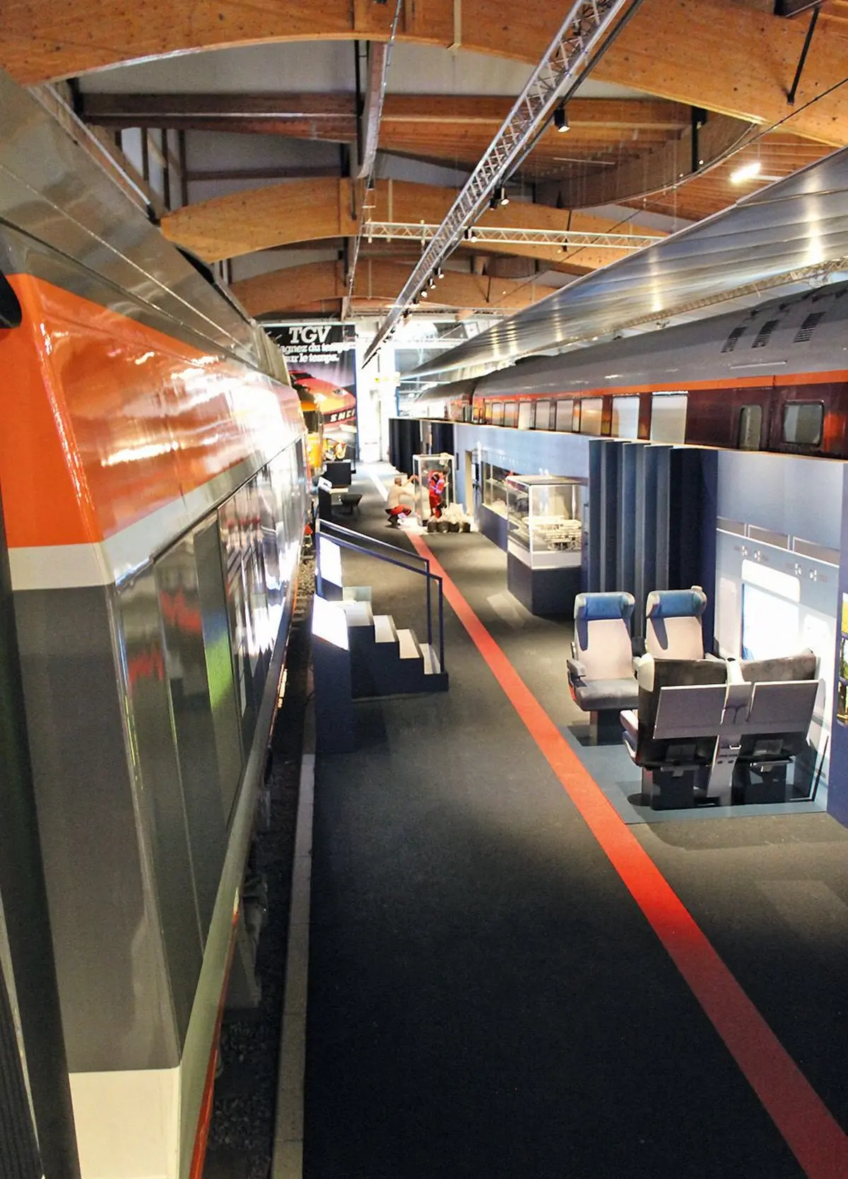 Il nous emmène alors sur « la Voie 12 », le nouvel espace d’exposition du musée, qui célèbre les 40 ans du TGV, tout juste inauguré à l’occasion des dernières Journées du Patrimoine. 20 mètres de voies spéciales grande vitesse ont été posées pour l’occasion. La motrice de TGV exposée ici ne bougera plus, mais le rail sur lequel elle repose, au moins, est authentique ! Plus loin sur la voie, on découvre : les secrets de design du TGV, la raison pour laquelle il fut décidé qu’il soit orange, ou son lien de parenté avec la Porsche Murène des années 70...