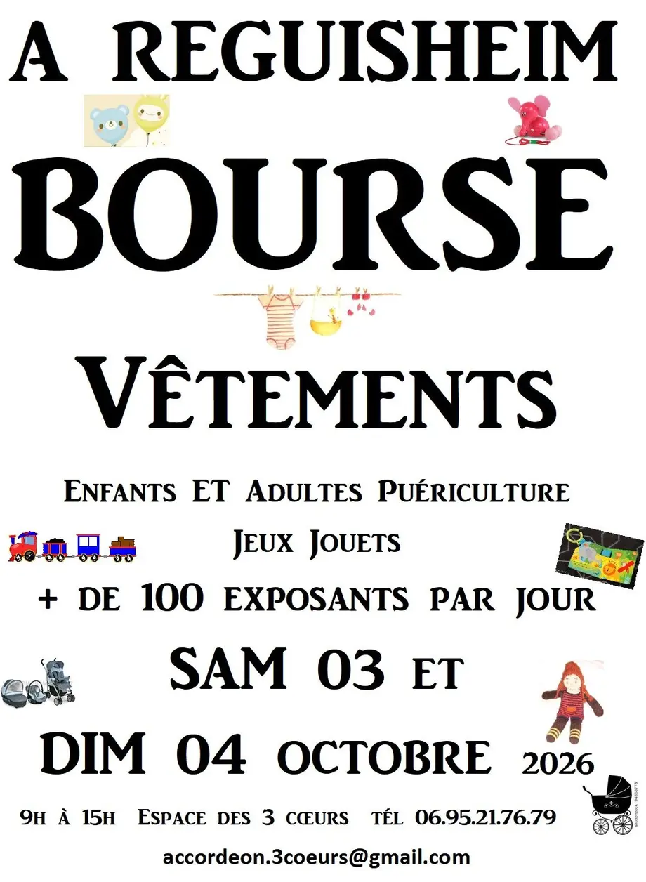 L'amicale des accordéonistes de Réguisheim organise sa bourse aux vêtements enfants, adultes, jeux, jouets, matériel de puériculture le week end du 03 et 04 octobre 2026.