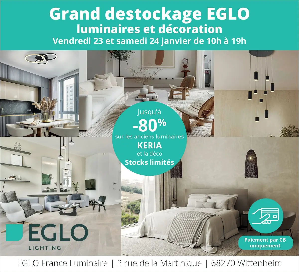 EGLO est une marque internationale de référence dans le domaine de l’éclairage décoratif et fonctionnel. Pour votre plus grand plaisir, l'enseigne organise un grand déstockage sur les luminaires et la décoration les 23 et 24 janvier 2026.