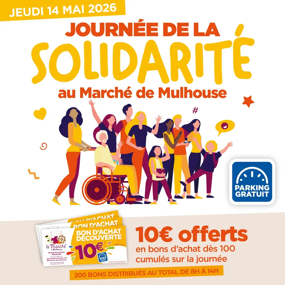 À l'occasion du jeudi de l'Ascension, le 14 mai 2026, le Marché de Mulhouse est ouvert pour sa Journée de Solidarité. Une journée placée sous le signe de la générosité et du pouvoir d'achat : en plus de l'ouverture exceptionnelle de vos commerçants, une opération spéciale est mise en place pour récompenser les clients fidèles.