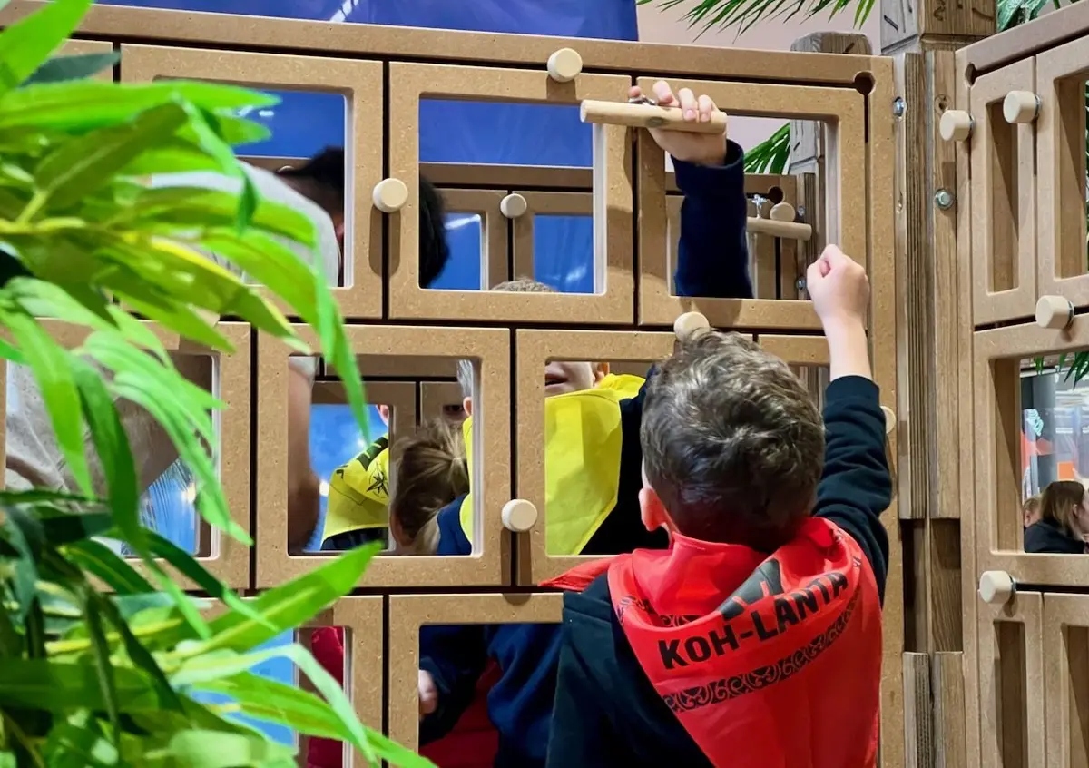 Inspiré d’une épreuve officielle de l’émission, les enfants devront faire évoluer un totem sur un parcours vertical grillagé afin de le libérer vers la sortie ! Ils doivent passer les mains à travers les cases et ne voient pas le chemin à emprunter, ils doivent donc se fier à leur sensation et instinct !