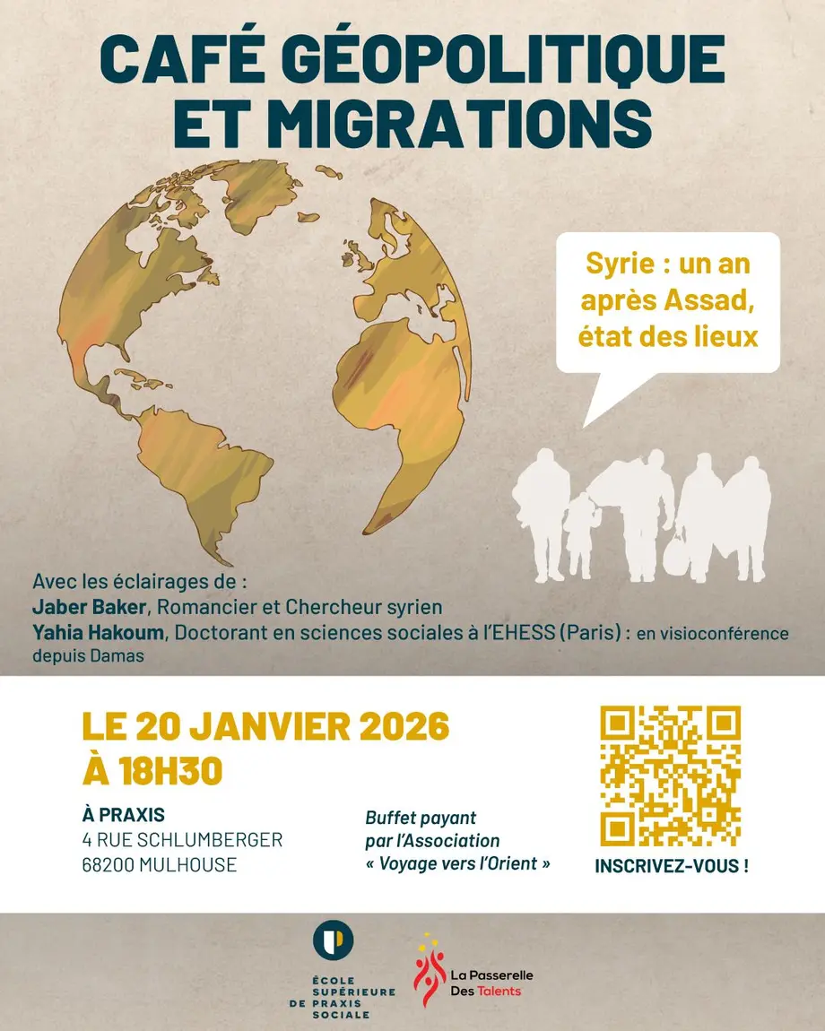 L'École Supérieure de Praxis Sociale et La Passerelle des Talents vous proposent un nouveau Café Géopolitique et Migrations sur le thème « Syrie : un an après Assad, état des lieux »