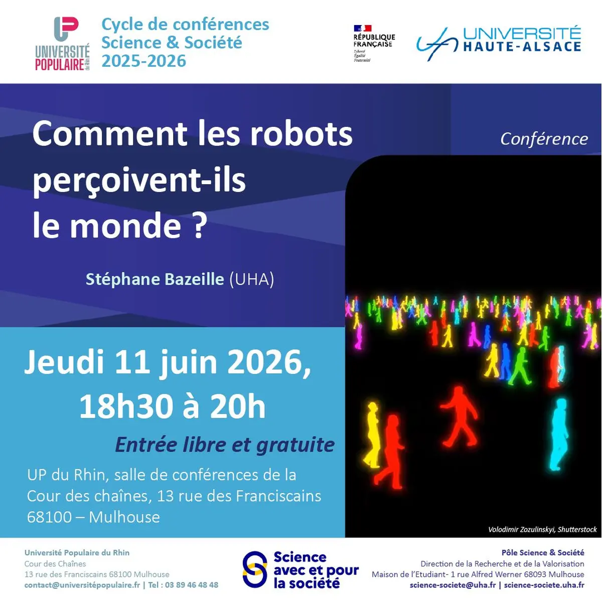 L'Université de Haute-Alsace et l'Université Populaire du Rhin vous invitent à la huitième et dernière conférence de leur cycle Science & Société pour découvrir comment les robots perçoivent le monde.