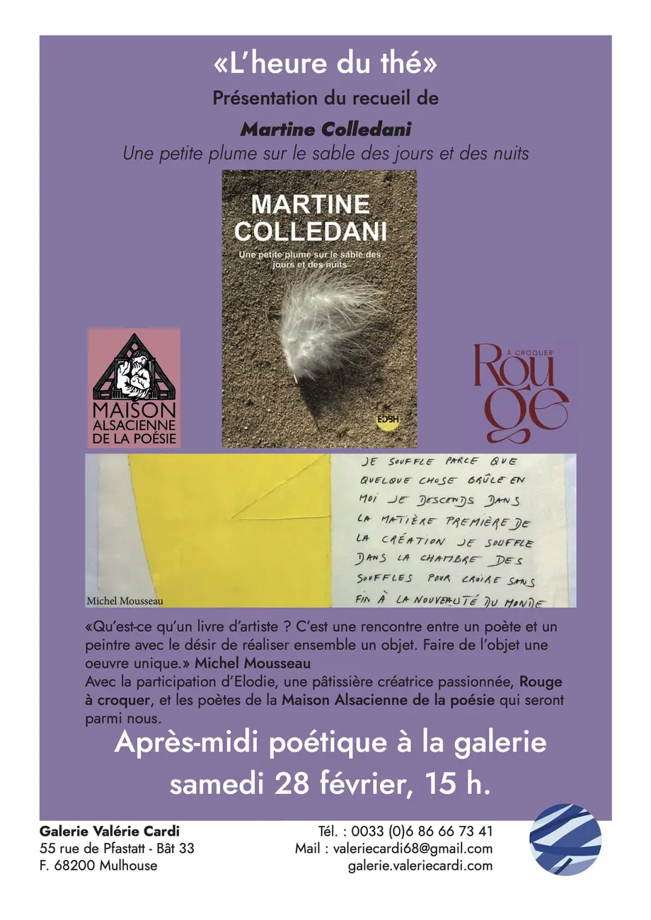 Samedi 28 février à 15h, lecture du dernier recueil de Martine Colledani, "Une petite plume sur le sable des jours et des nuits".