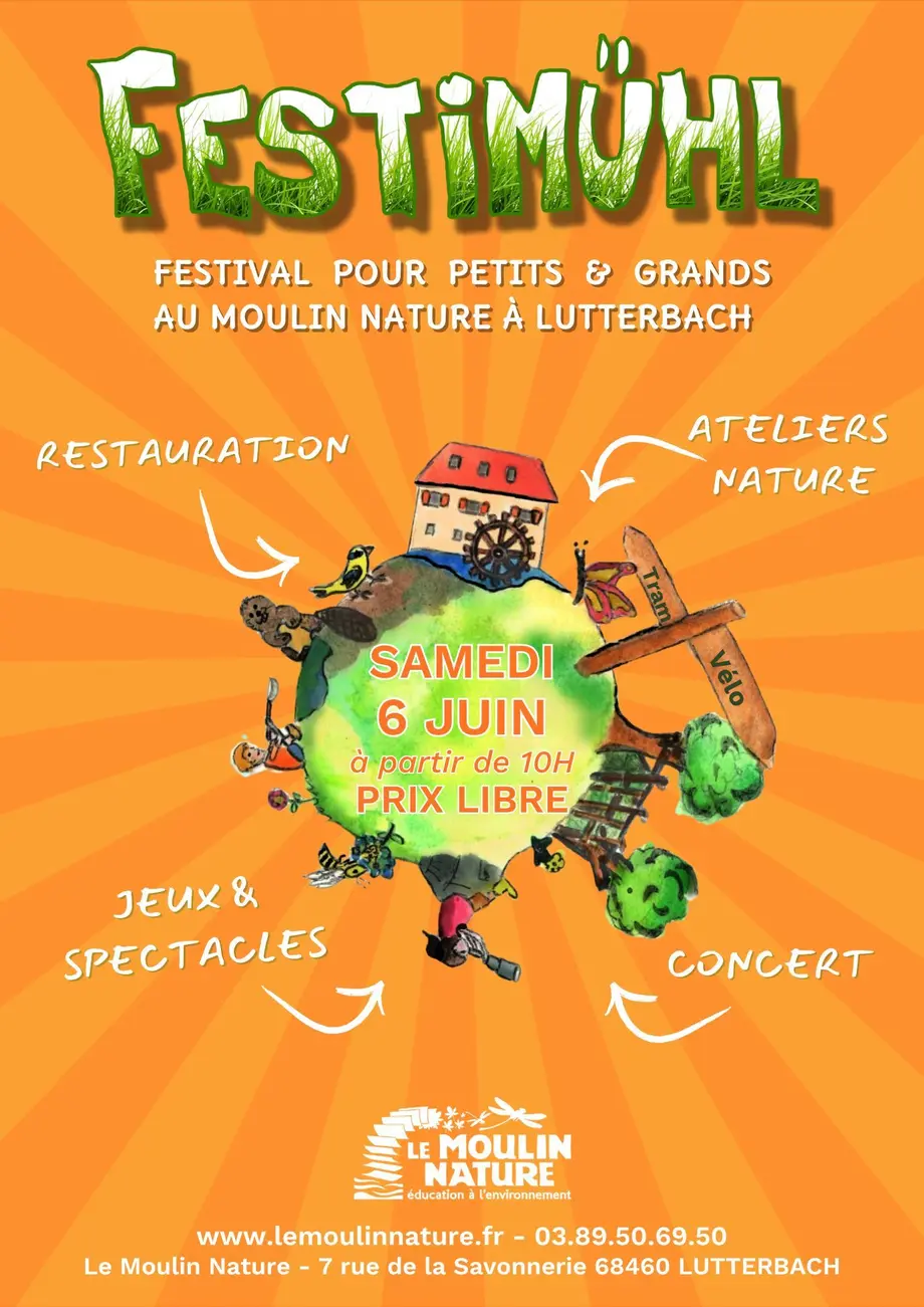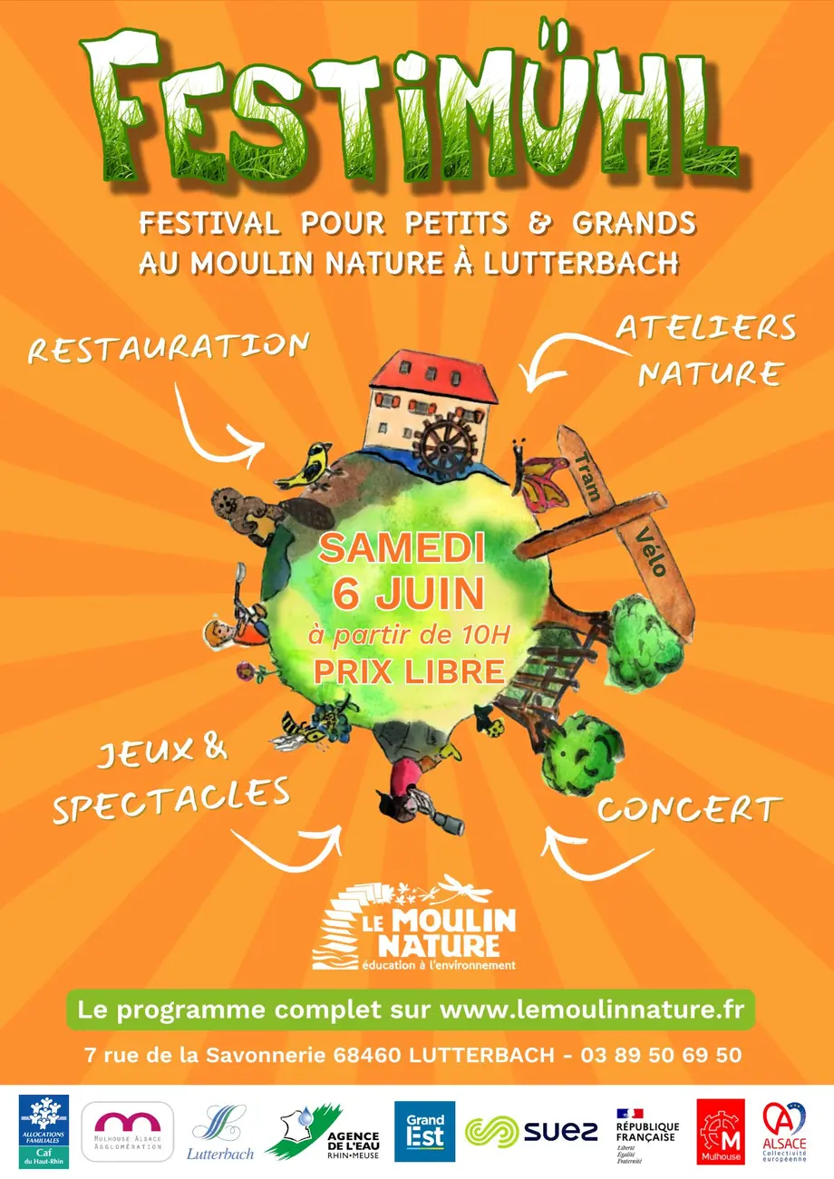 Le festival Festimühl revient le samedi 6 juin au Moulin Nature à Lutterbach pour une nouvelle journée placée sous le signe de la nature et de la biodiversité. Ouvert à tous, petits et grands sont invités à venir découvrir, apprendre et partager autour des enjeux environnementaux dans une ambiance conviviale et festive.