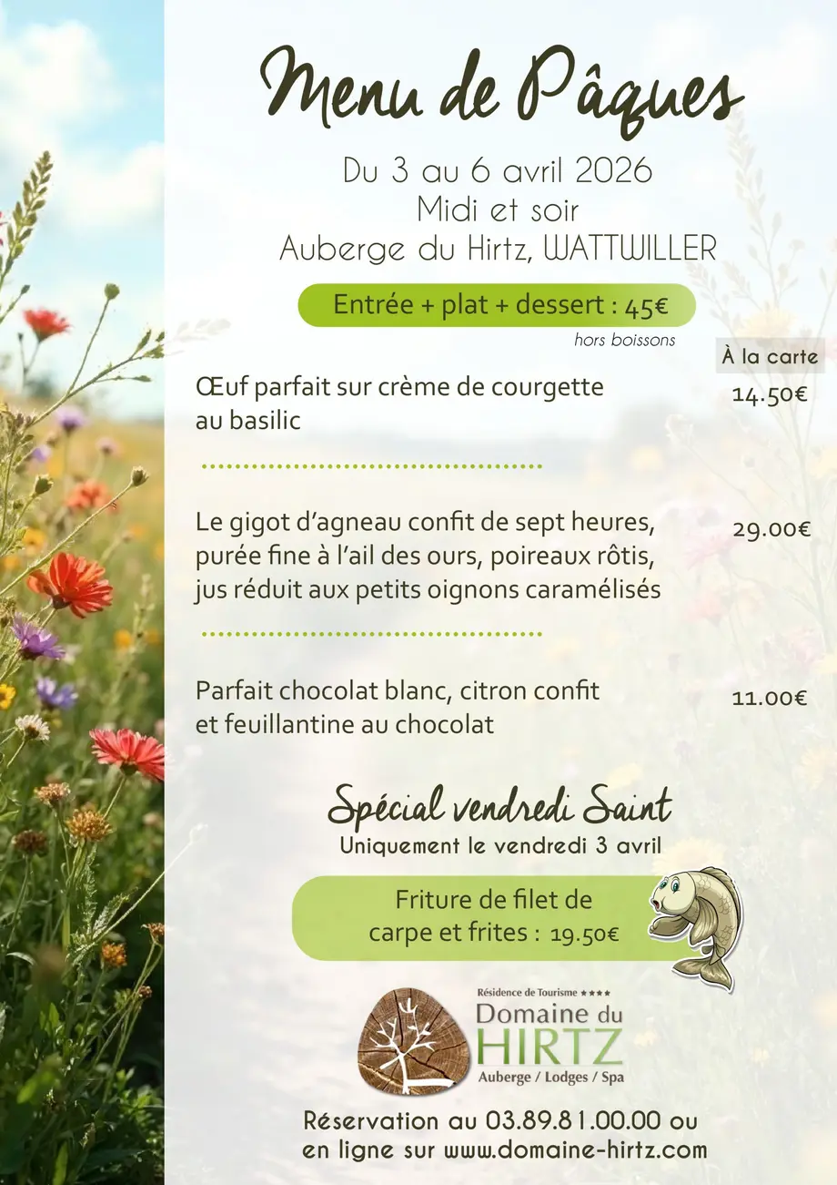 À l’occasion du week-end de Pâques, l’Auberge du Hirtz à Wattwiller vous propose un menu spécial à savourer du 3 au 6 avril 2026, le midi et le soir.
