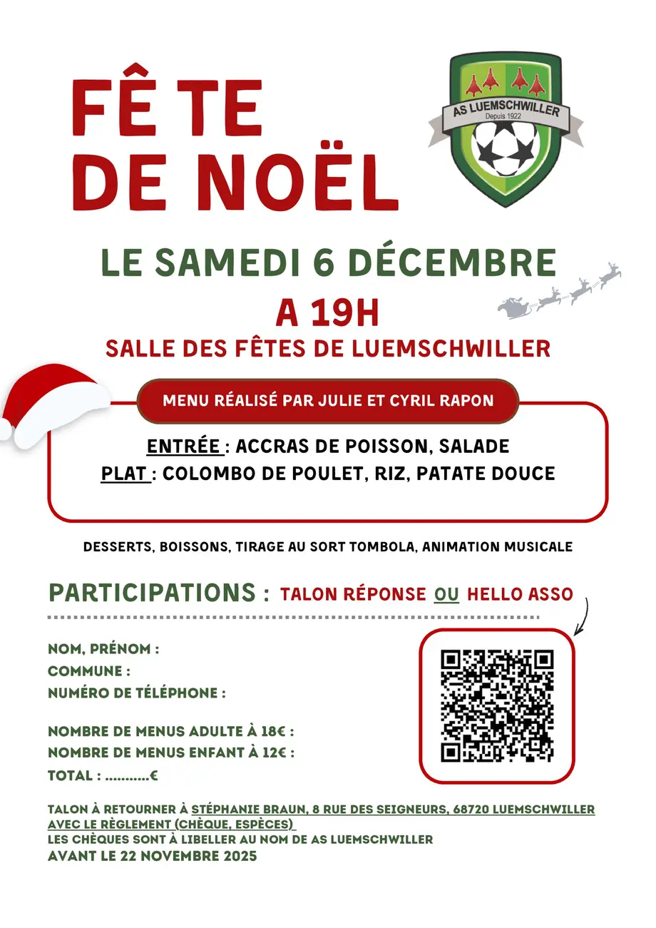 L’AS Luemschwiller organise sa traditionnelle fête de Noël le 6 décembre 2025 à la salle des fêtes de Luemschwiller. Venez partager un délicieux repas et profitez de l’ambiance festive.
