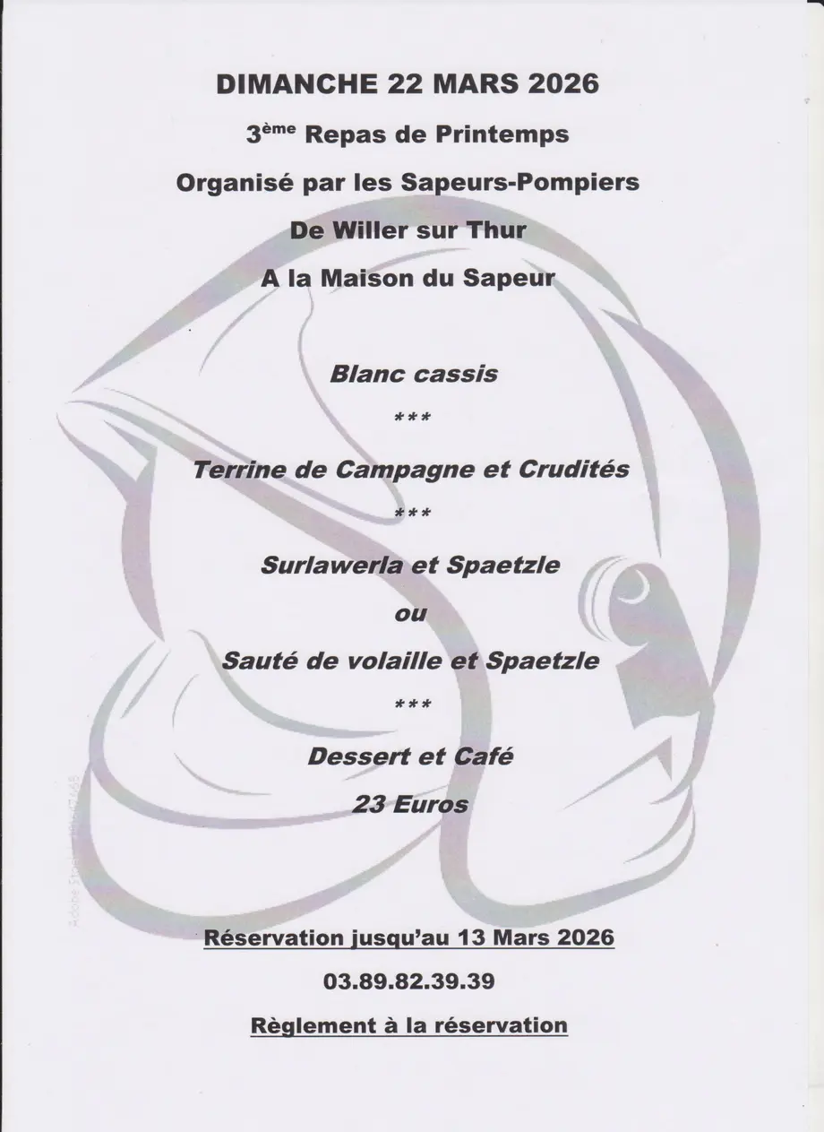 L'amicale des sapeurs pompiers de Willer sur thur organise son 3éme repas de printemps le dimanche 22mars 2026.