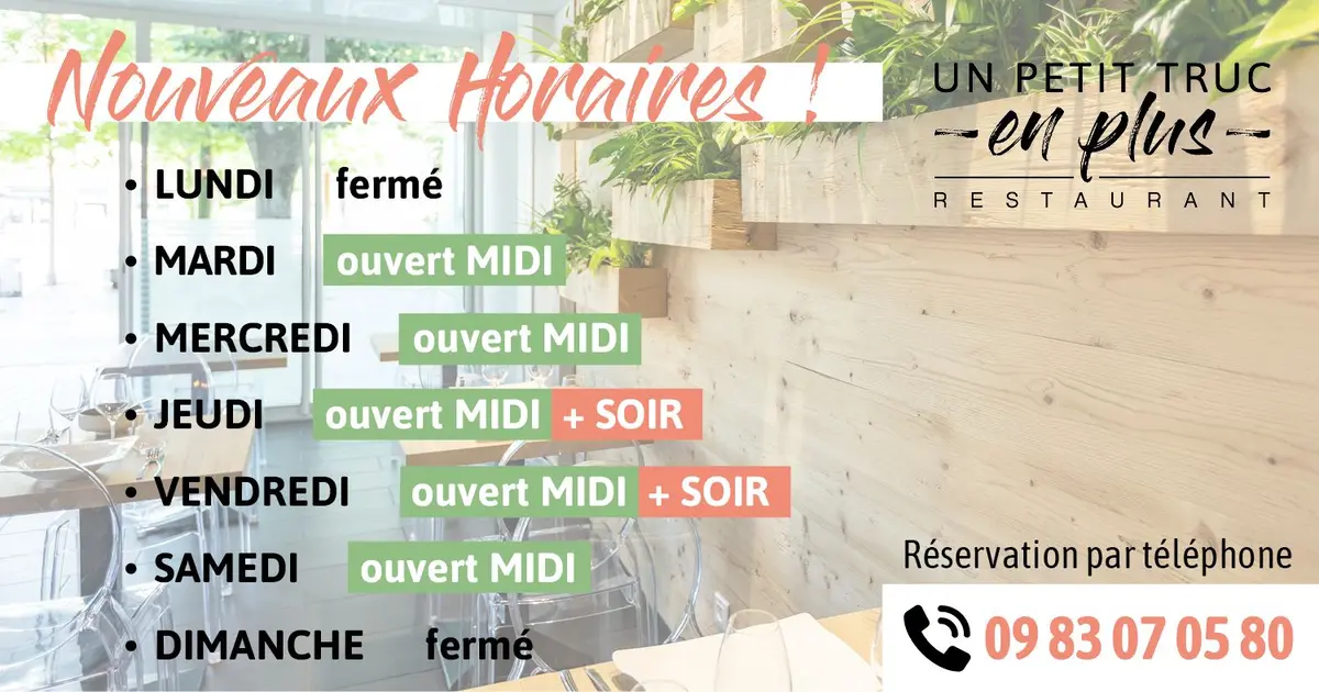 mardi 12h-14h, mercredi 12h-14h, jeudi 12h-14h & 19h-22h, vendredi 12h-14h & 19h-22h, samedi 12h-14h