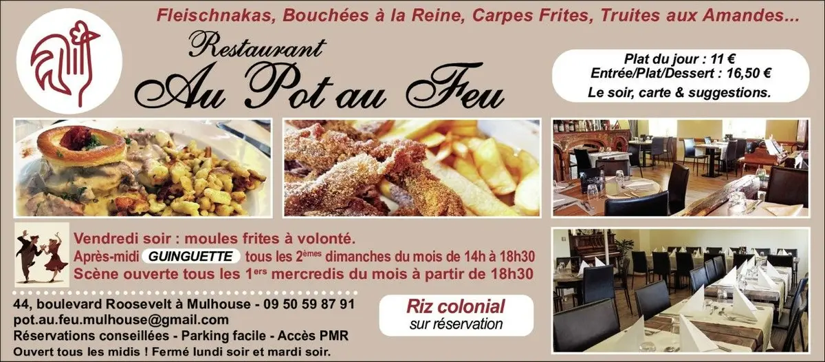 Au centre de Mulhouse, le restaurant Le Pot Au Feu propose de ramener "la mer sur votre table". Malgré quelques incontournables (bouchées à la reine, Surlawerla,...), le restaurant se distingue particulièrement par sa carte de poissons.