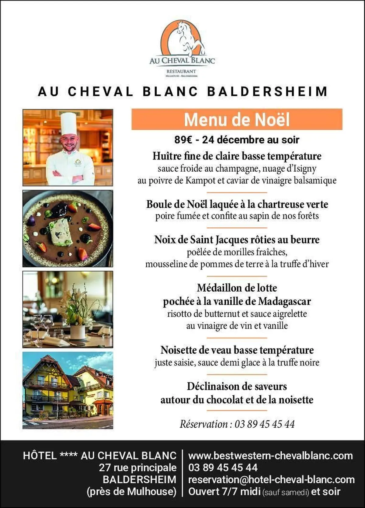 Célébrez Noël en famille autour d'un bon repas ! Le restaurant de l'hôtel Best Western Au Cheval Blanc à Baldersheim vous a réservé deux menus d'exception pour les soirs des 24 et 25 décembre 2025. Découvrez le menu, réservez votre table et profitez d'un succulent repas !