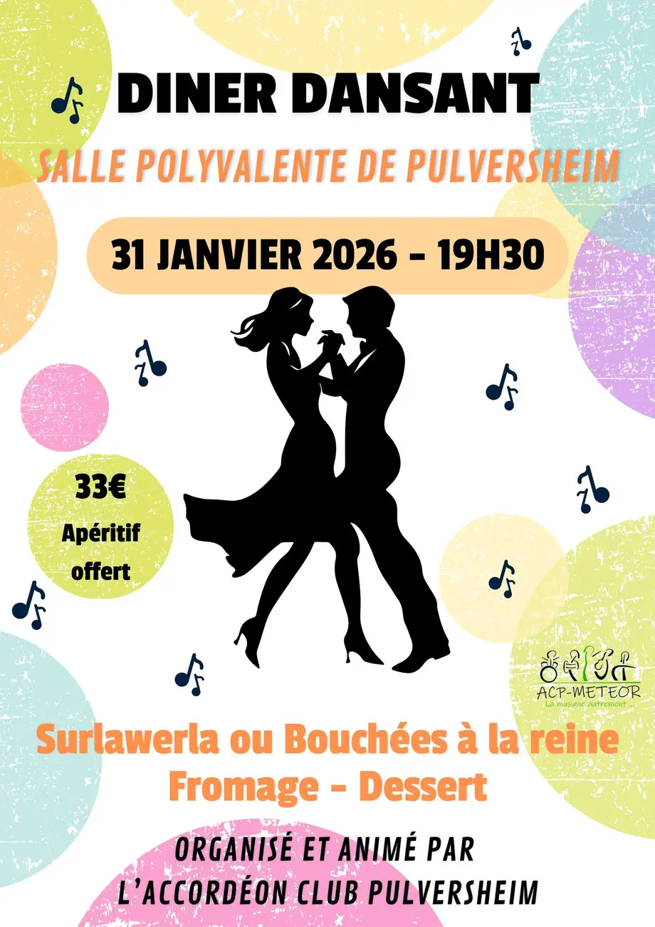 L’accordéon club Pulversheim vous invite à sa traditionnelle Soirée dansante qui aura lieu le 31 janvier 2026 à 19h30 à la salle polyvalente de Pulversheim.