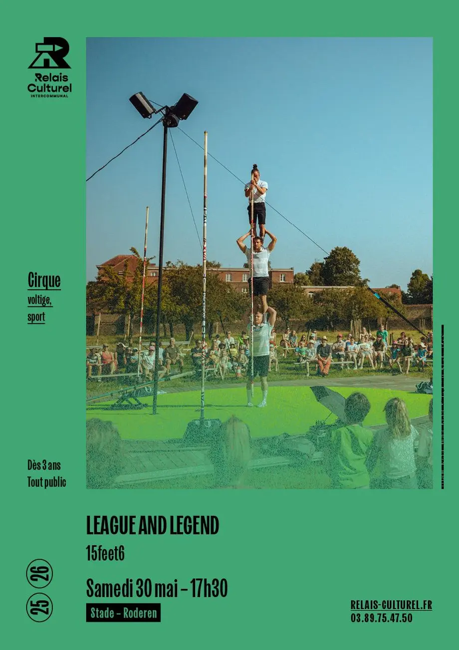 Dans League and Legend, la compagnie 15Feet6 entre sur le terrain comme dans une arène sportive. Armés de perches de saut et de ruban adhésif, les artistes s’élancent dans une succession de défis spectaculaires et absurdes, pulvérisant un à un les records imaginaires qui se dressent sur leur chemin.