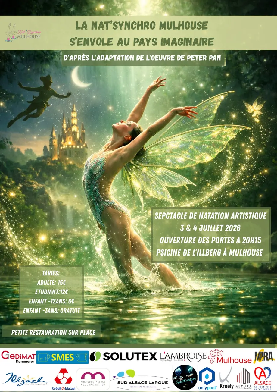 Cette année, la Nat'Synchro Mulhouse vous invite à prendre votre envol vers un univers magique et intemporel avec un spectacle féérique inspiré de Peter Pan. Un battement de cils… une étincelle… et vous voilà transportés dans un monde où tout devient possible.